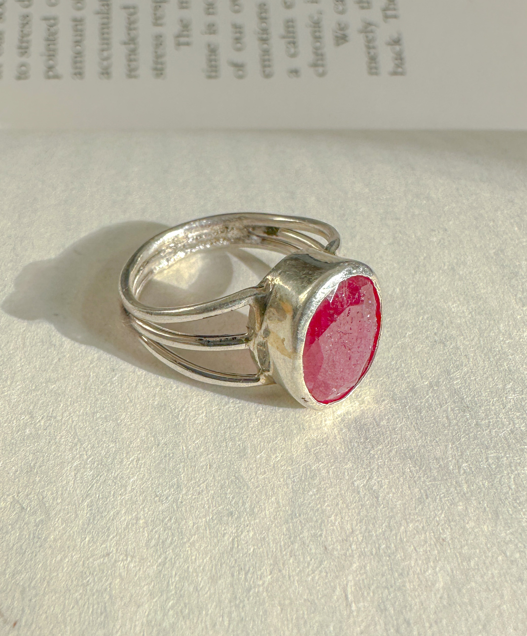 Aadi Pink Sapphire Ring with a vivid pink natural sapphire set in sterling silver bezel setting. Two rings are available in UK size O/US 7