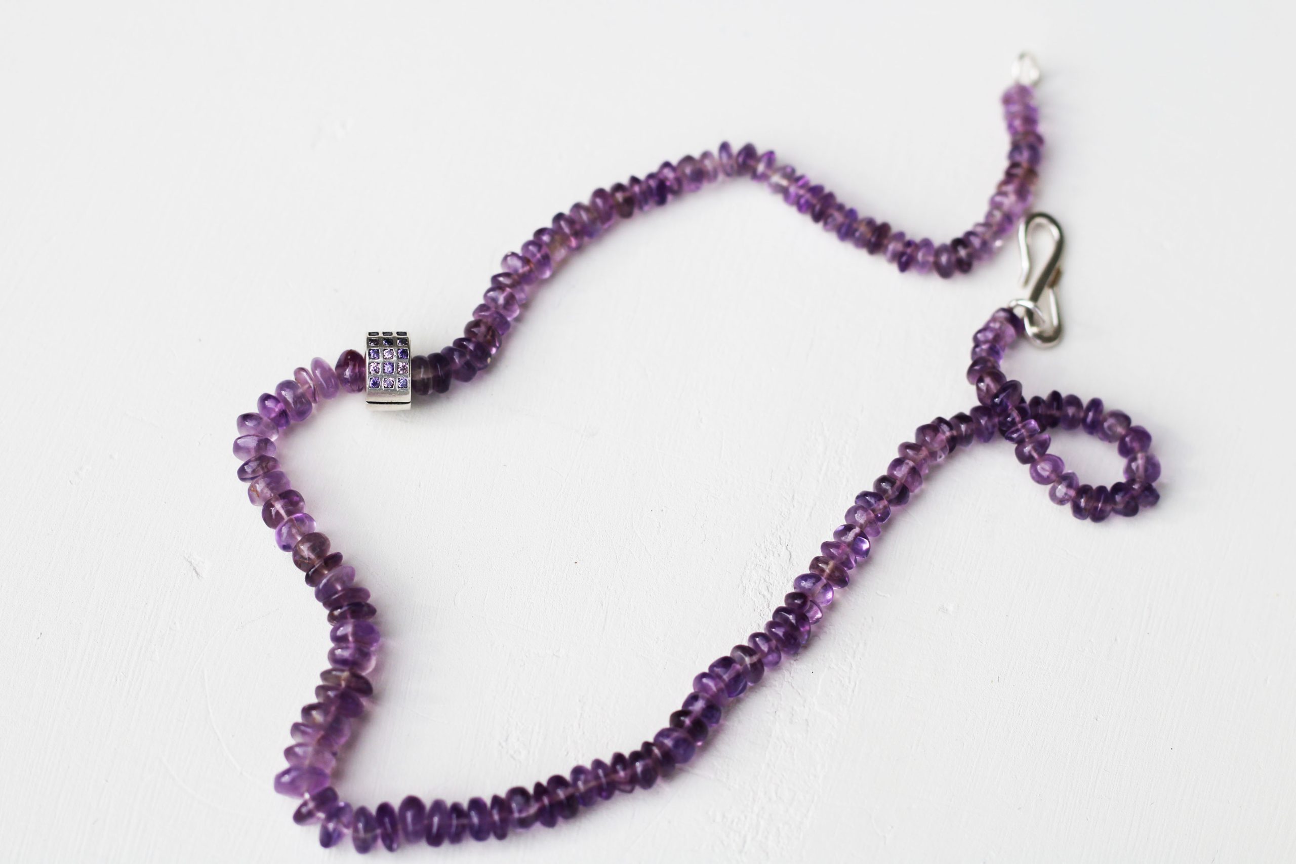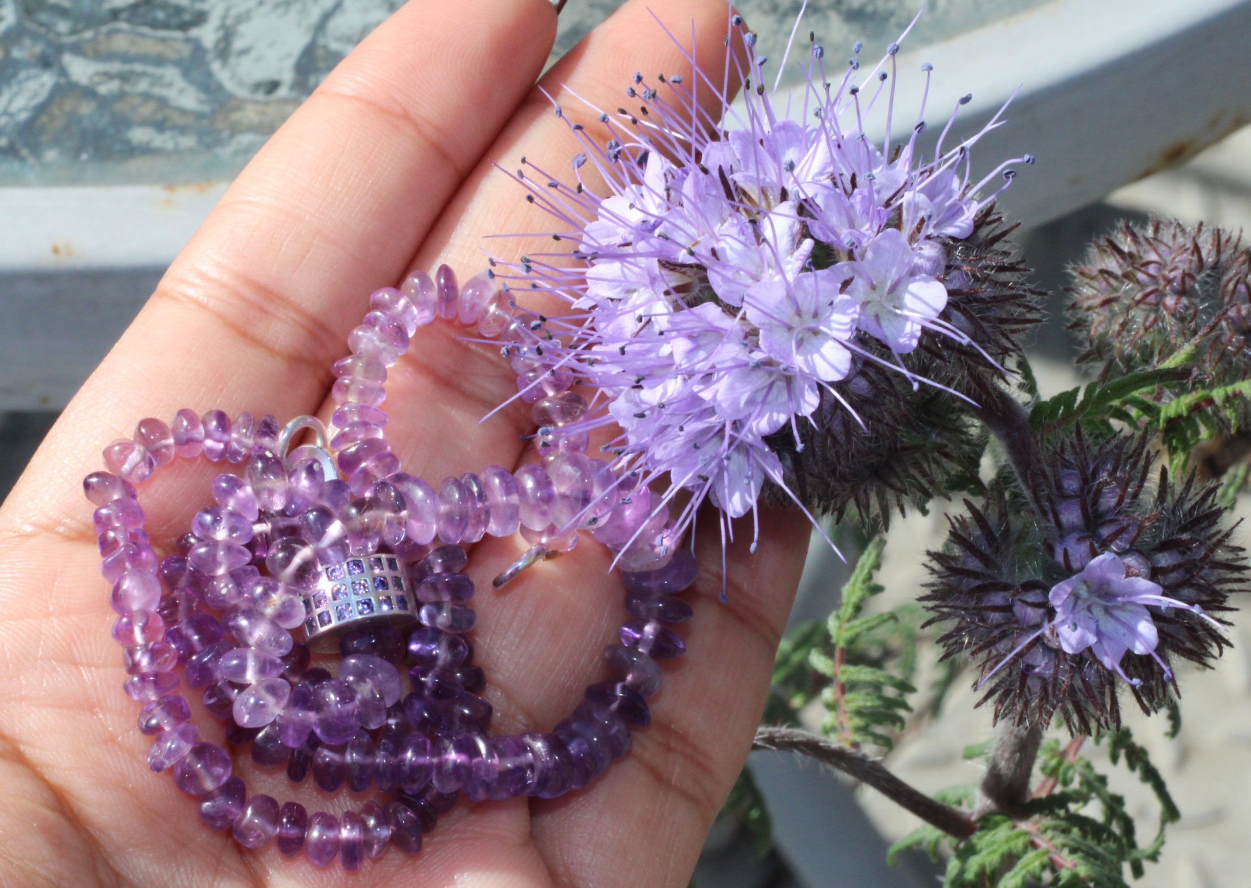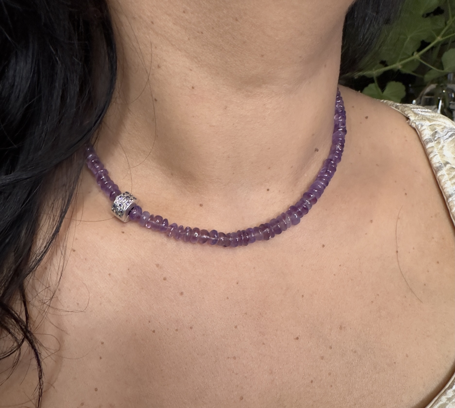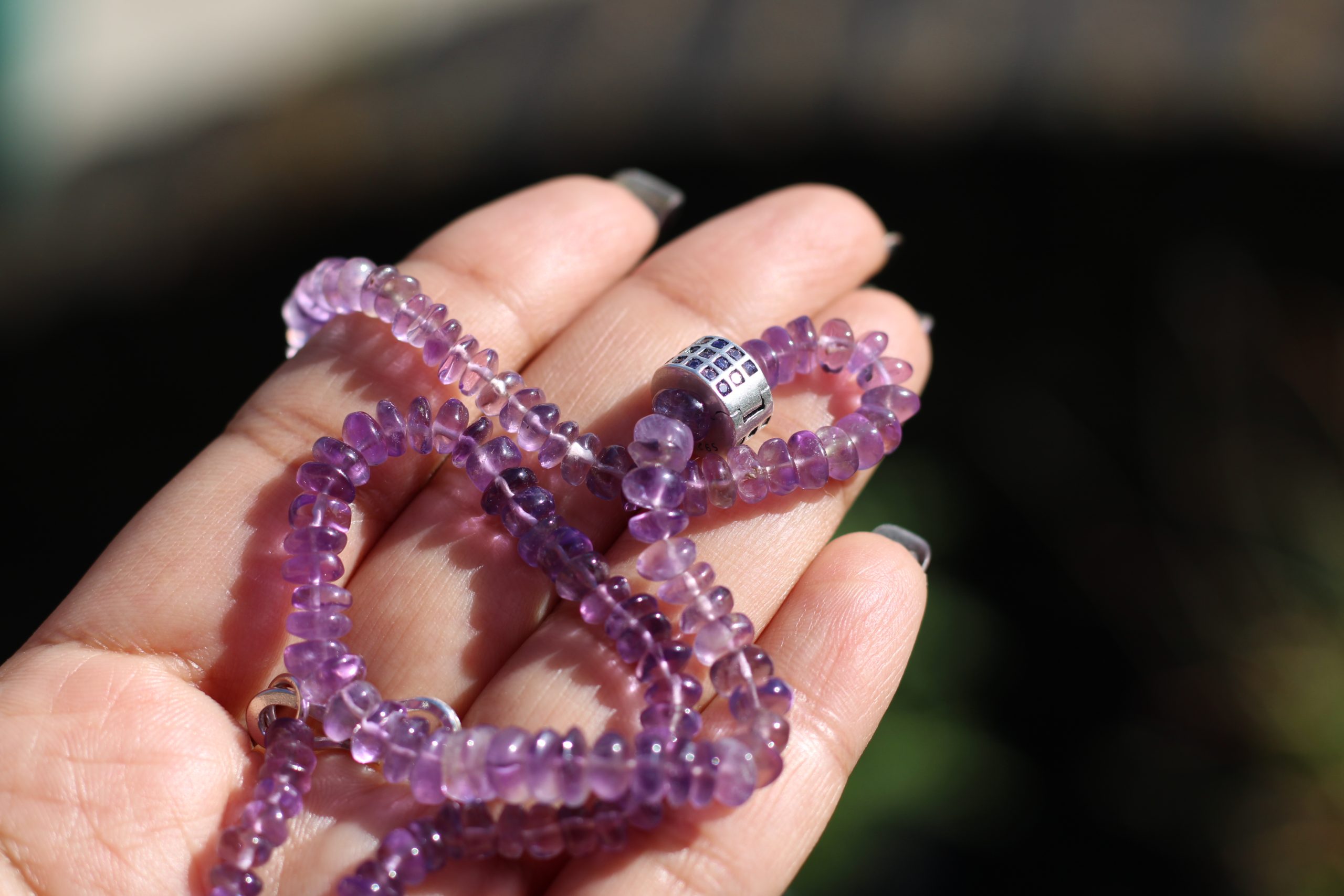 Out stylish Aditya Amethyst Crystal Necklace is made of best quality rondelle shaped small amethyst beads. Amethyst crystals have stunning natural purple hue; all pictures are taken in natural sunlight.