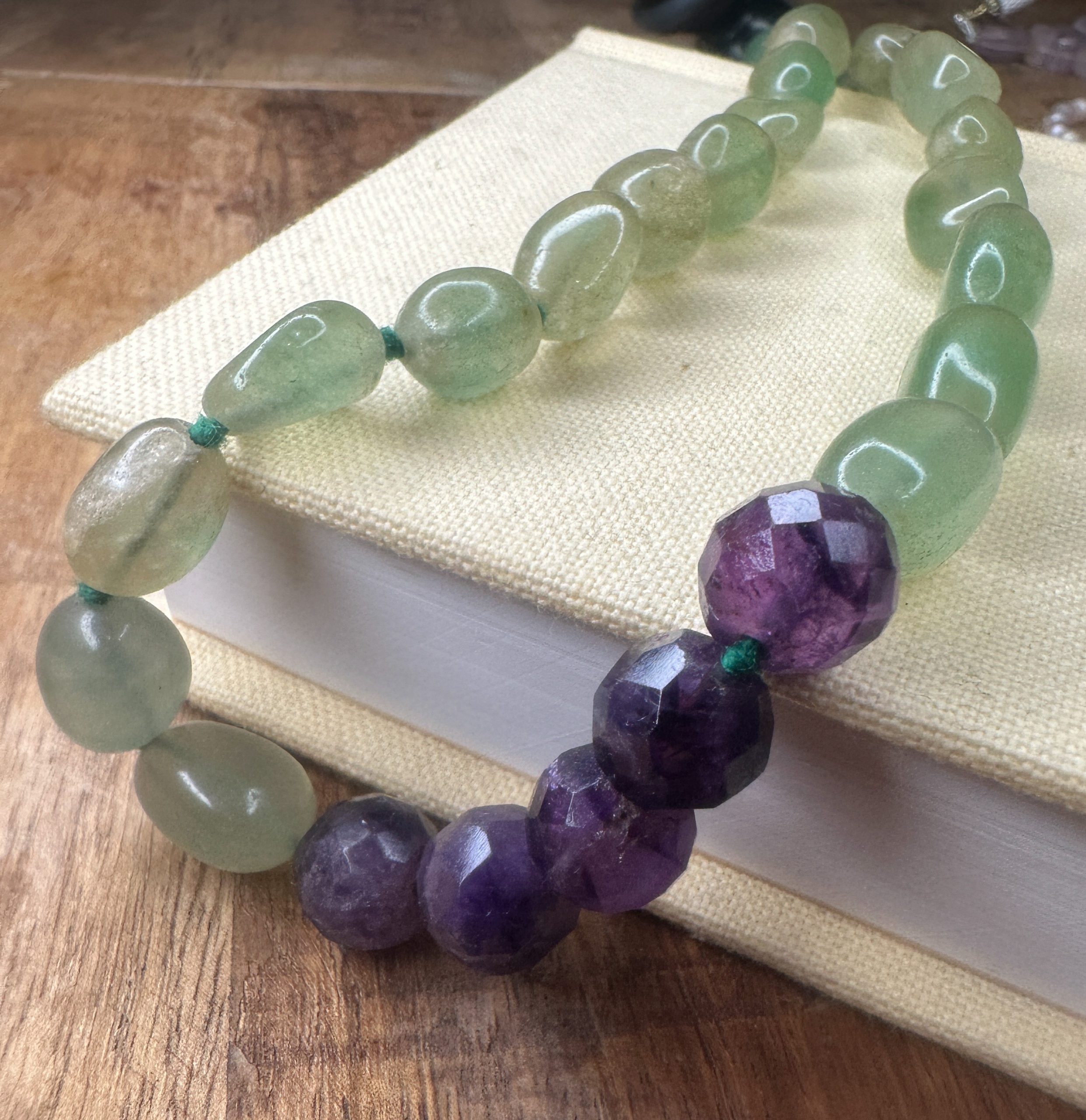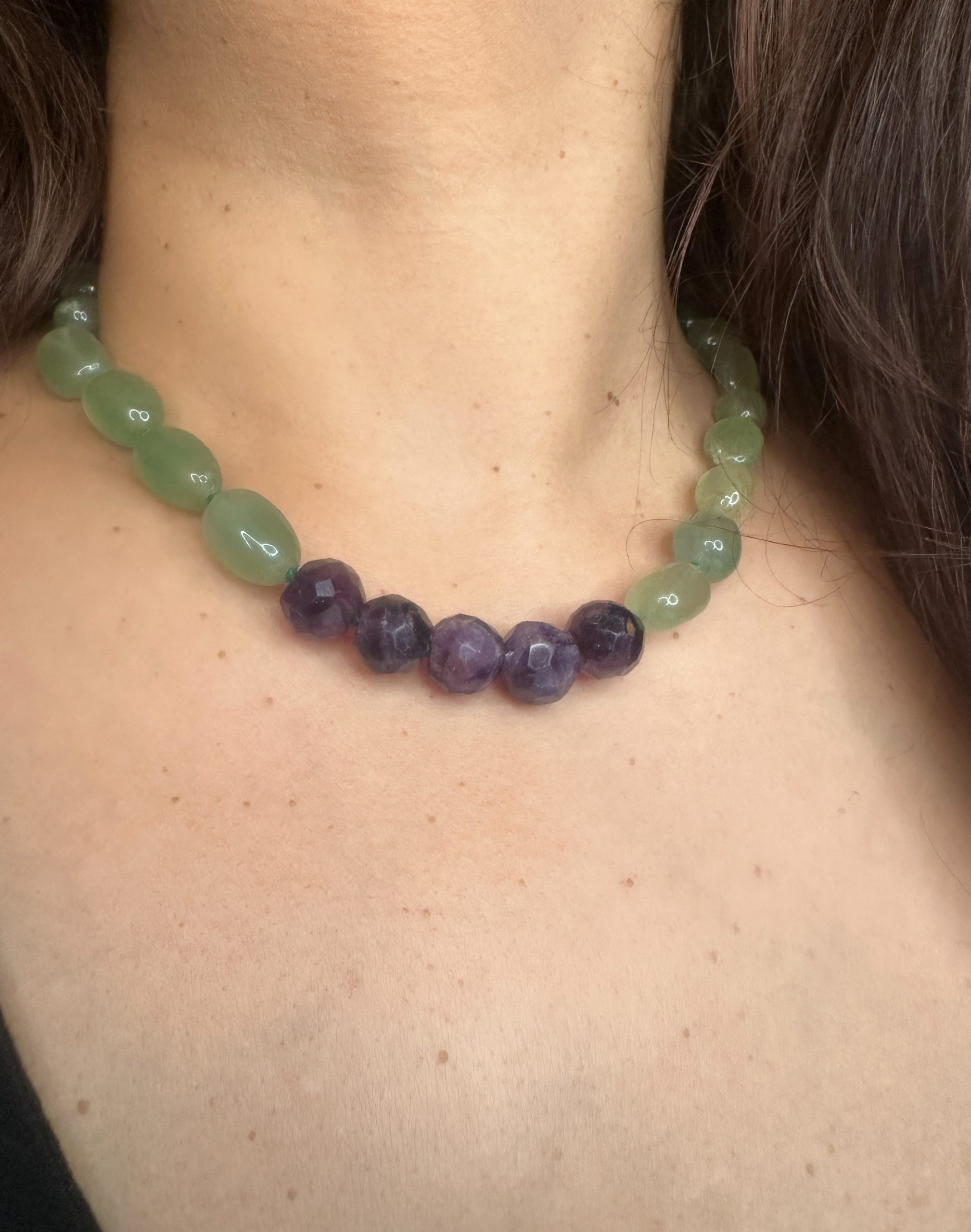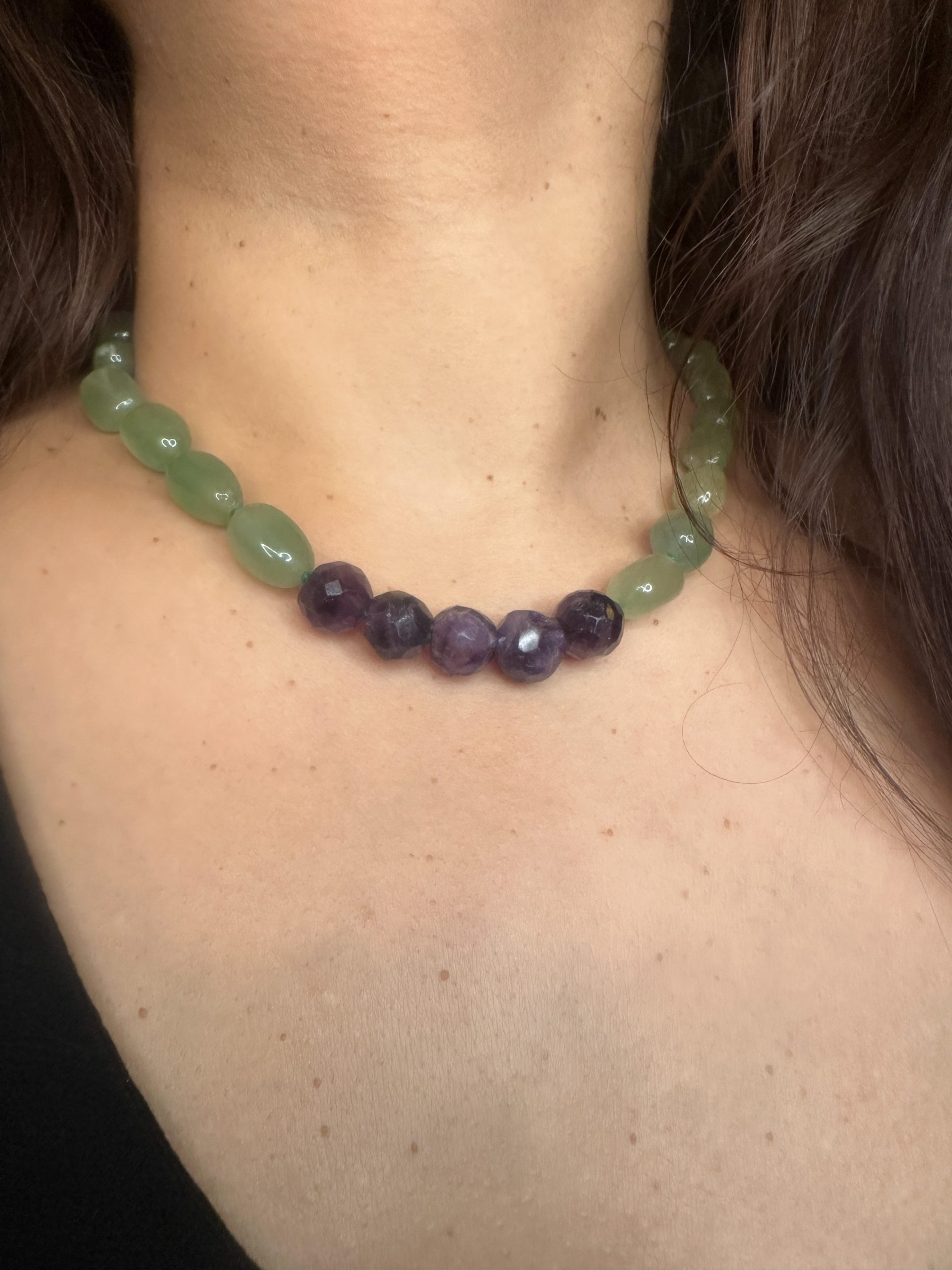 Siya Amethyst & Green Aventurine Necklace with shimmering amethyst with deep purple hue complimenting bright green aventurine beads.