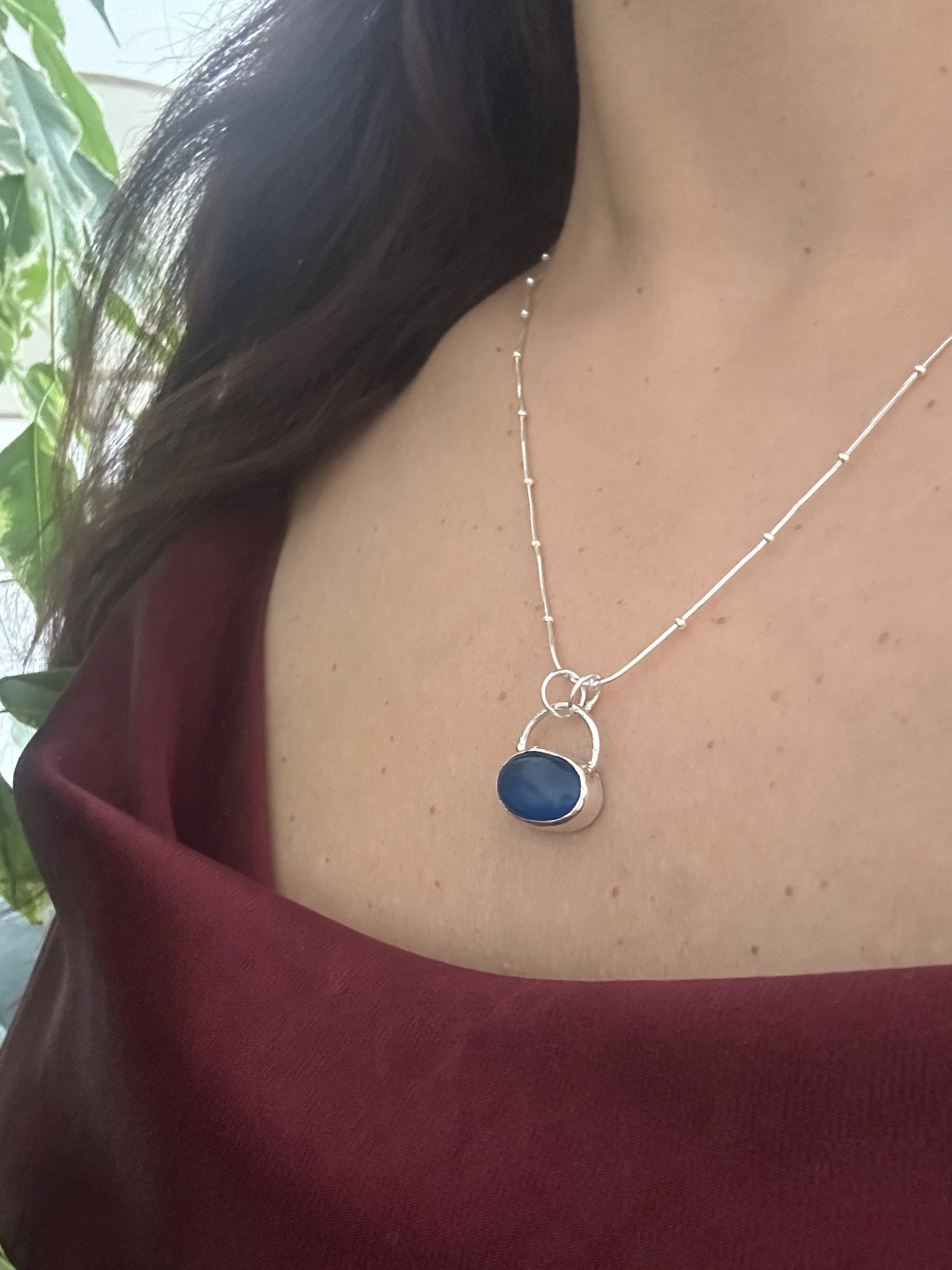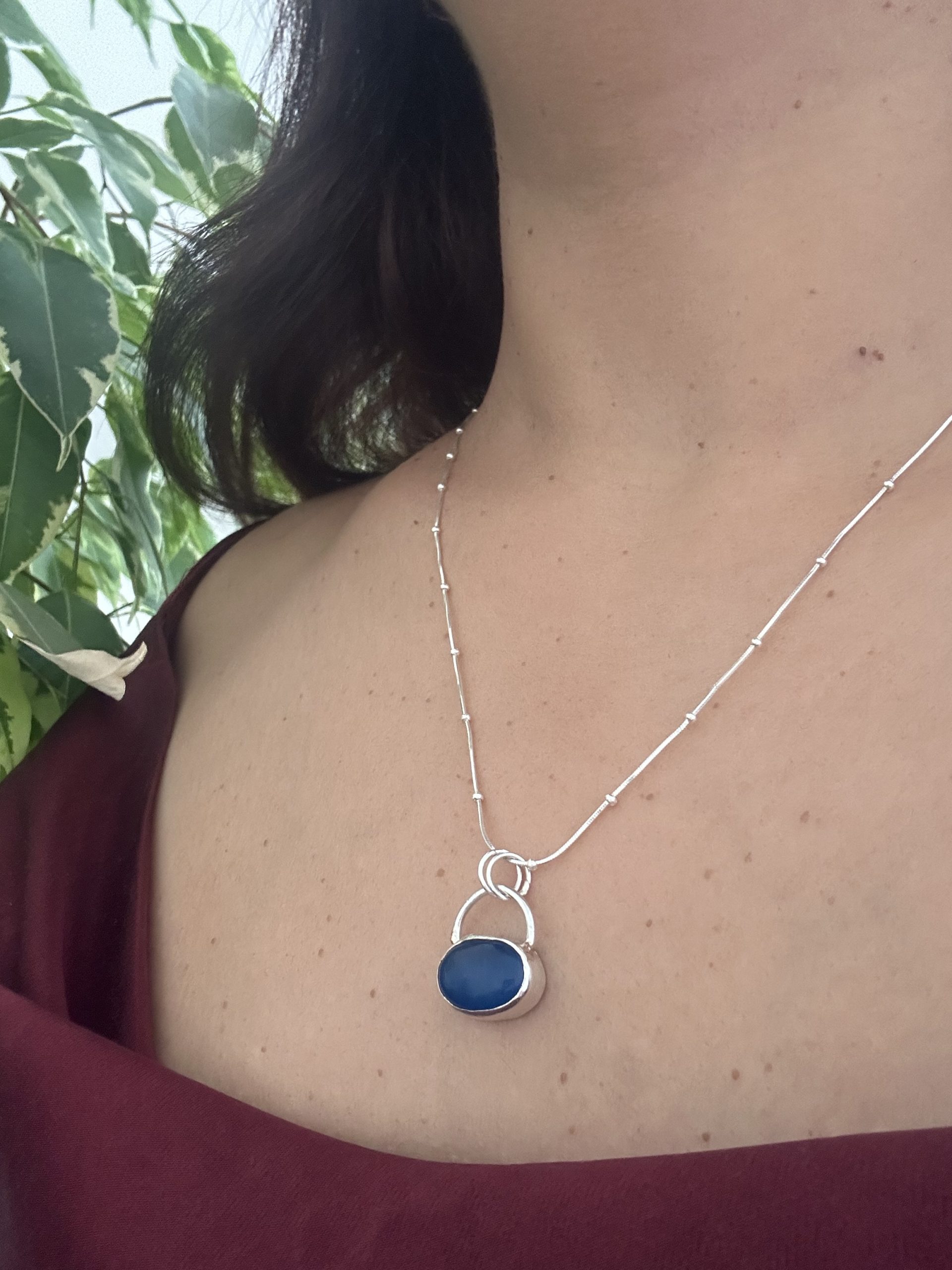 Introducing our stunning Neela Saras Blue Chalcedony Pendant, a true testament to elegance and simplicity. This oval-shaped pendant is meticulously handcrafted in sterling silver, ensuring a timeless and durable piece. The minimalist design accentuates the natural beauty of the gemstone, showcasing its royal blue hue. Perfect for any occasion, this chic pendant adds a touch of sophistication to your ensemble. Embrace the charm of this exquisite, handmade treasure and let its serene color bring a sense of calm and style to your collection.
