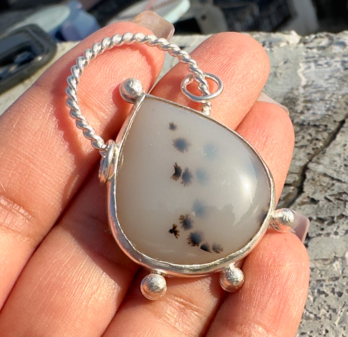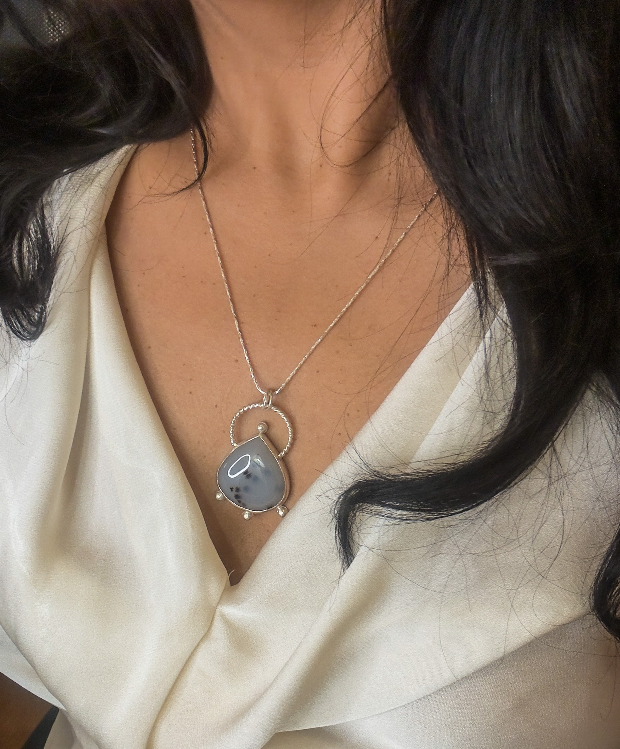 Christy Dendritic Agate Pendant Necklace with Dendritic Agate set in sterling silver. Handmade pendant comes with 18 in sterling silver chain.