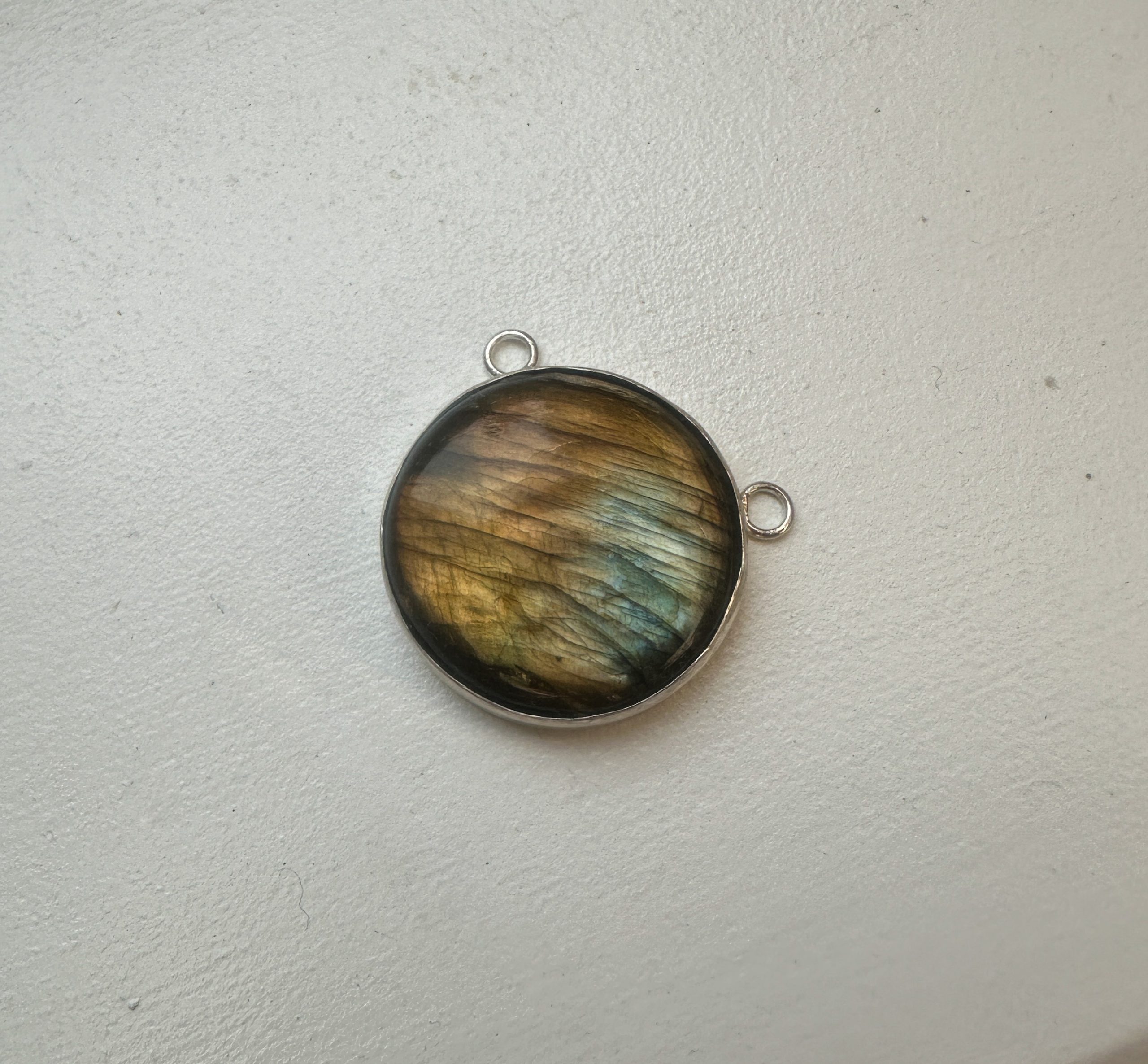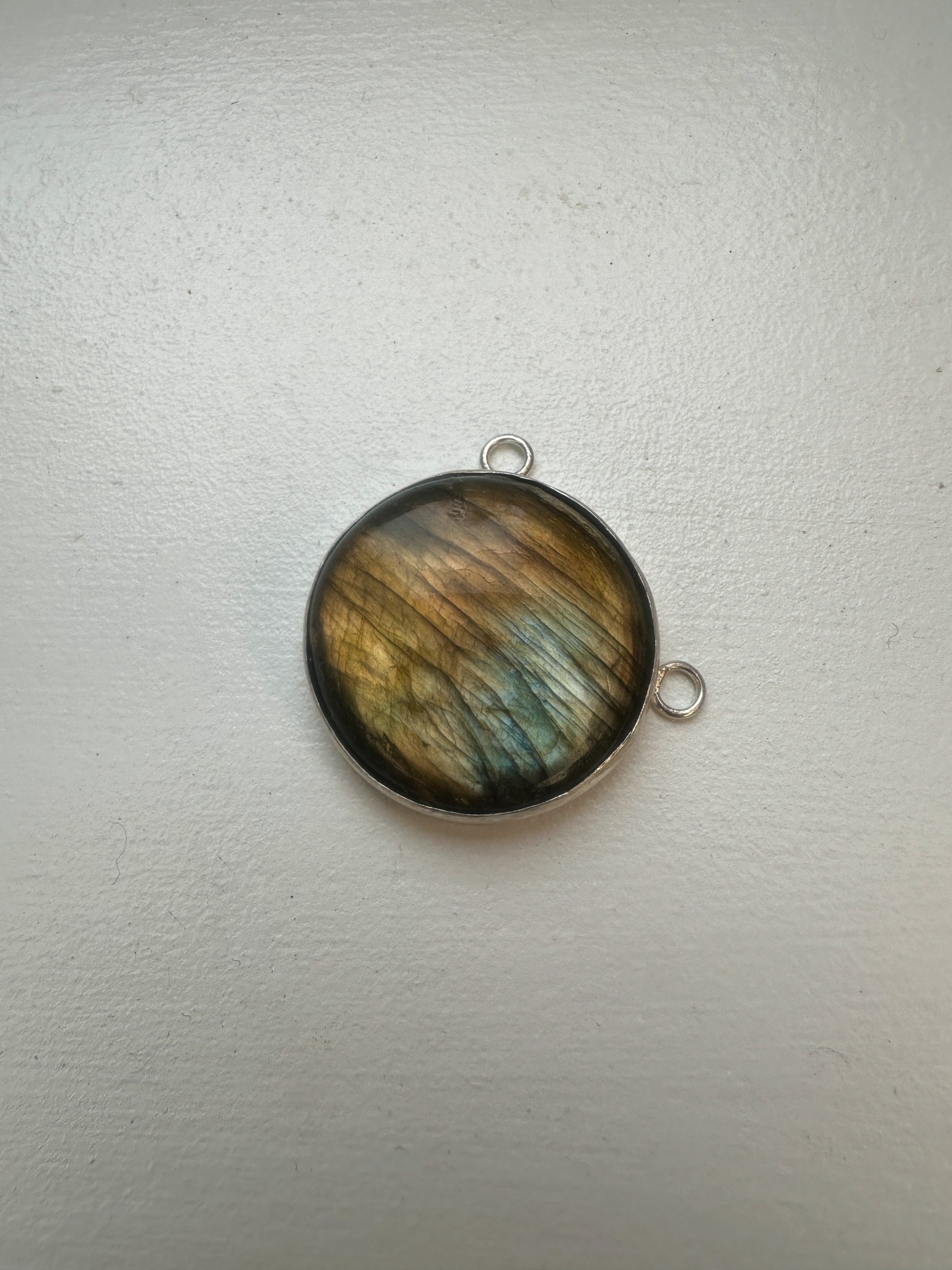This stunning large round labradorite pendant is a true statement piece, showcasing the mesmerizing play of color that labradorite is known for. The gemstone’s iridescent hues shift from deep golden tones to shimmering blues and warm browns, creating a captivating effect as the light hits it from different angles. Set in a sleek, stylish design, the pendant is paired with a silver chrome chain that perfectly complements its natural beauty. The pendant also features elegant, modern hooks for added sophistication, making it the perfect accessory for any outfit, from casual to chic.