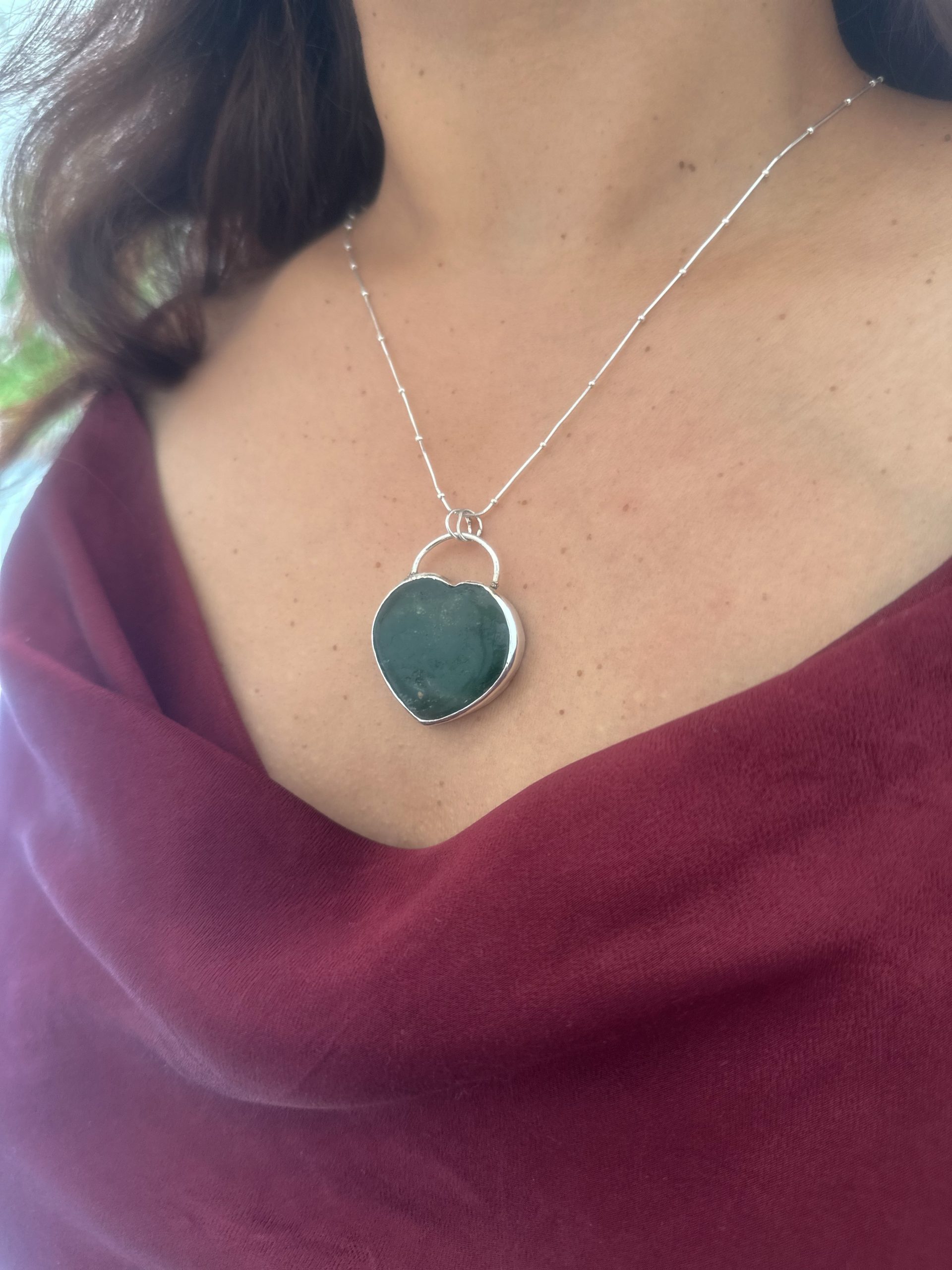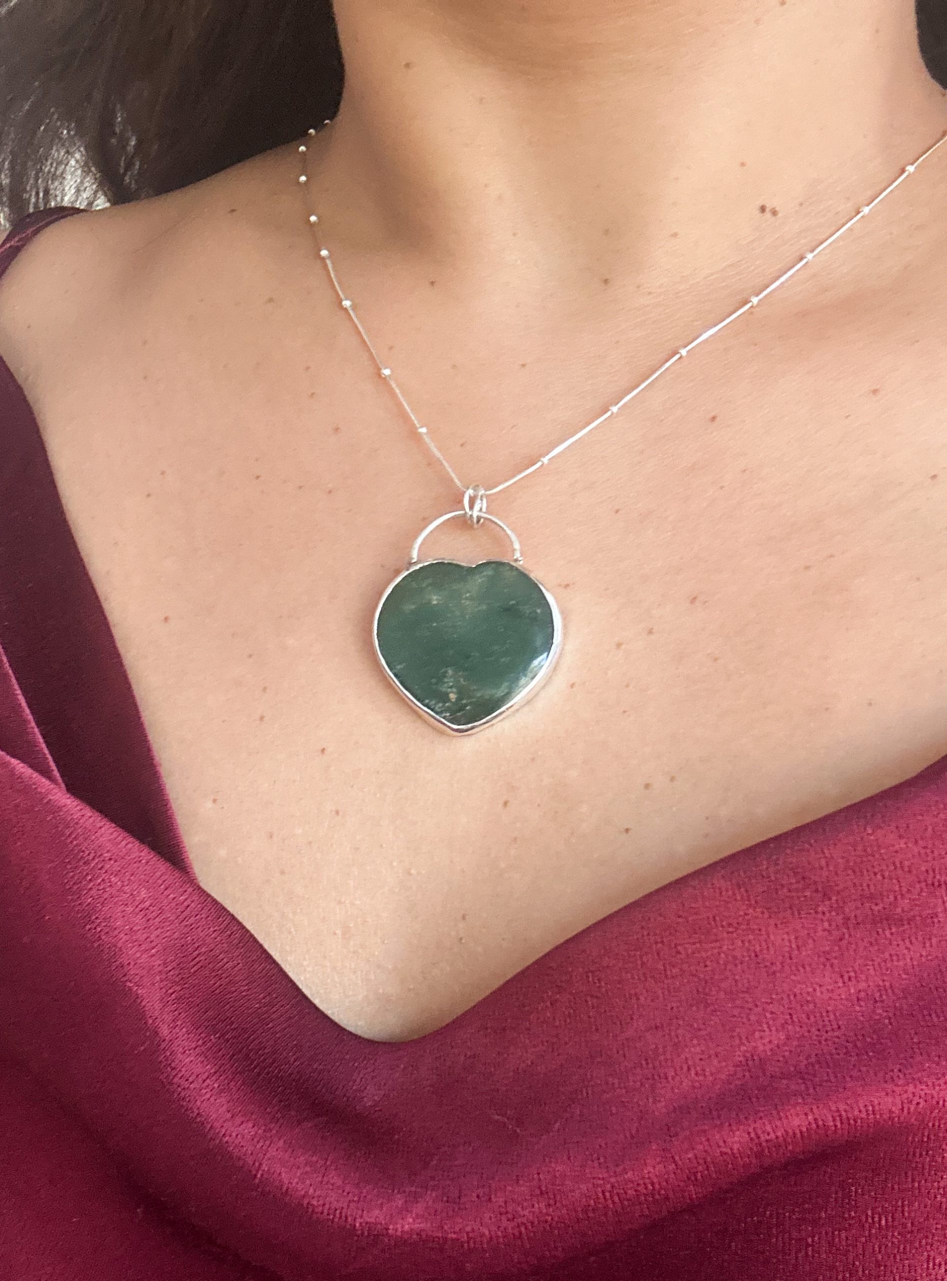 Embrace the boho chic style with our enchanting large Green Aventurine Heart Pendant. This pendant features a beautifully crafted heart-shaped green aventurine crystal, renowned for its soothing properties and ability to attract luck and prosperity. The vibrant green hue of the aventurine heart stone exudes a sense of tranquility and harmony, making it a perfect love gift for someone special. Whether for daily wear or a special occasion, this pendant embodies a blend of elegance and positive energy, making it a must-have addition to your jewelry collection.