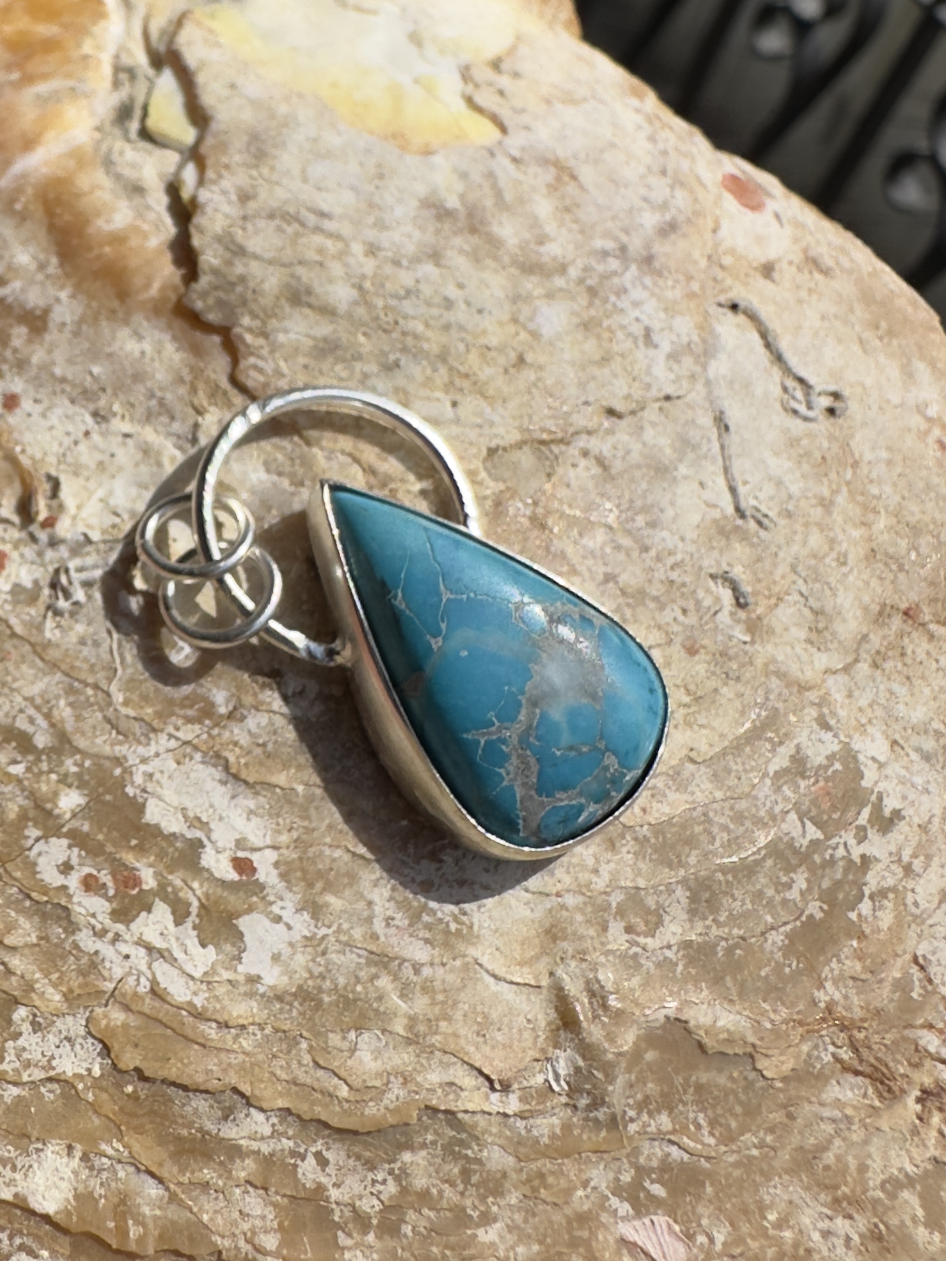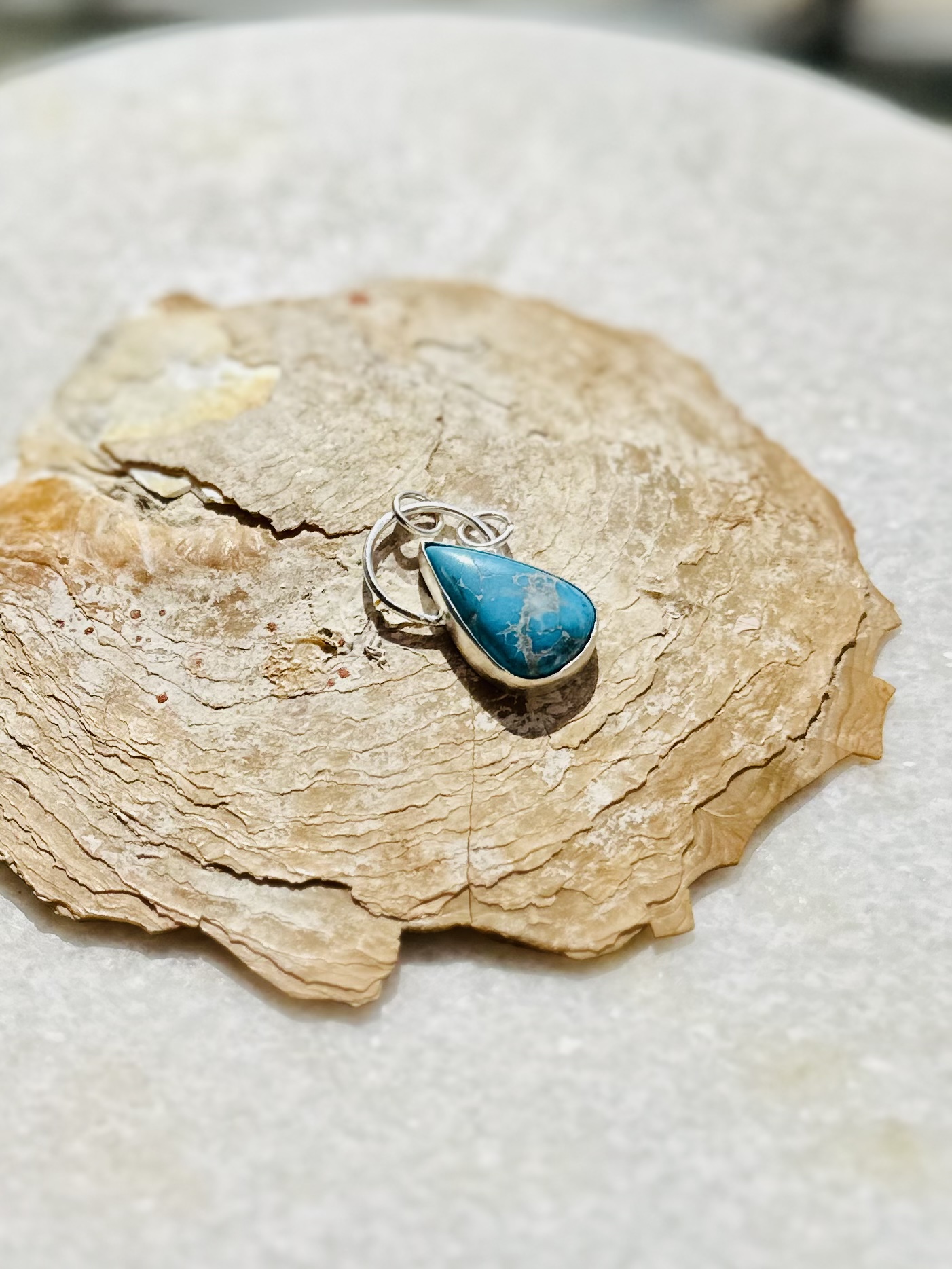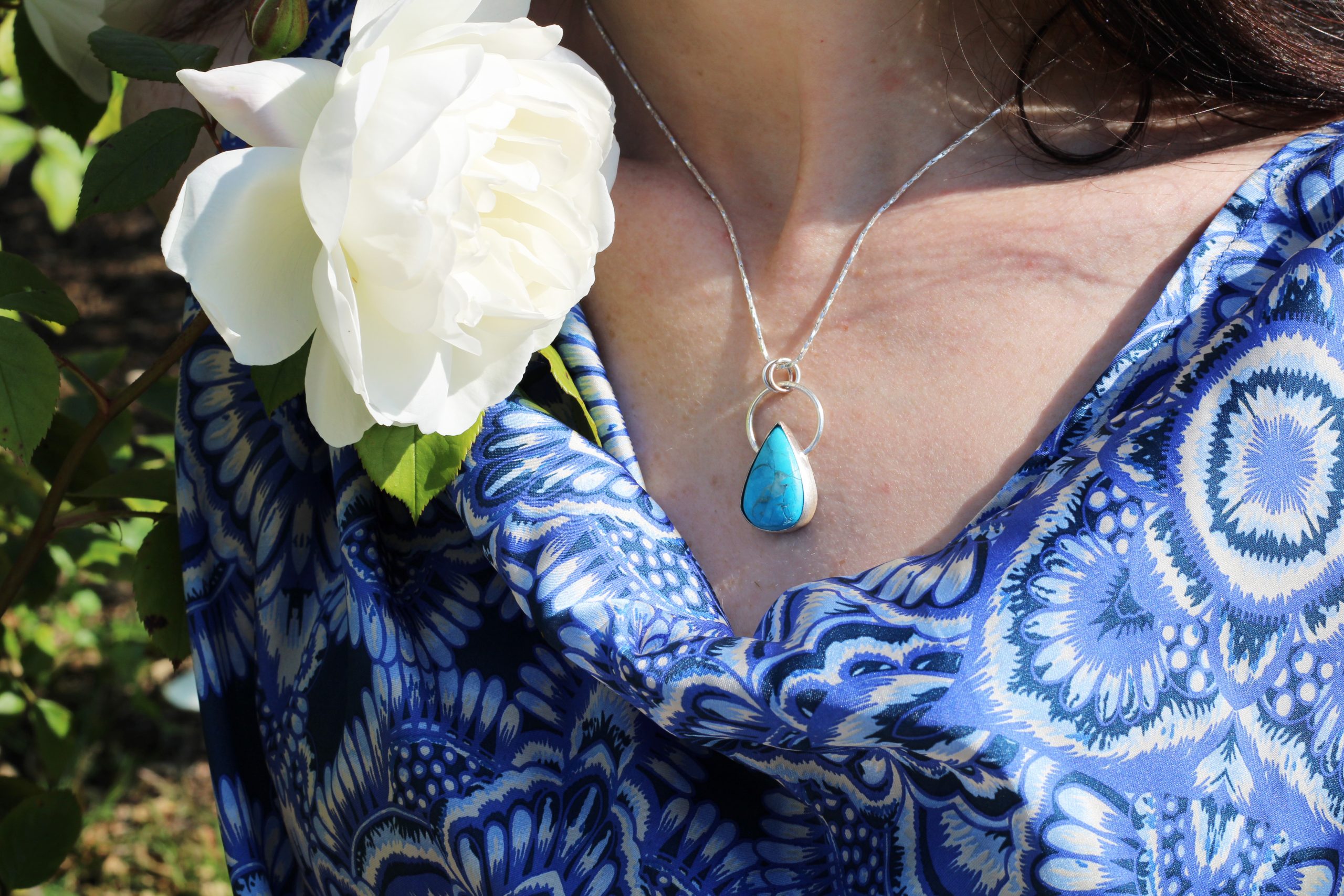 A stunning and vibrant turquoise teardrop is set in a handmade sterling and fine silver setting. This is a wear everyday, minimal, streamlined, and elegant turquoise necklace. The sterling silver chain is 20 in long. Best quality Nishapur turquoise that is polished on both sides has been used to create our Madhur pendants.