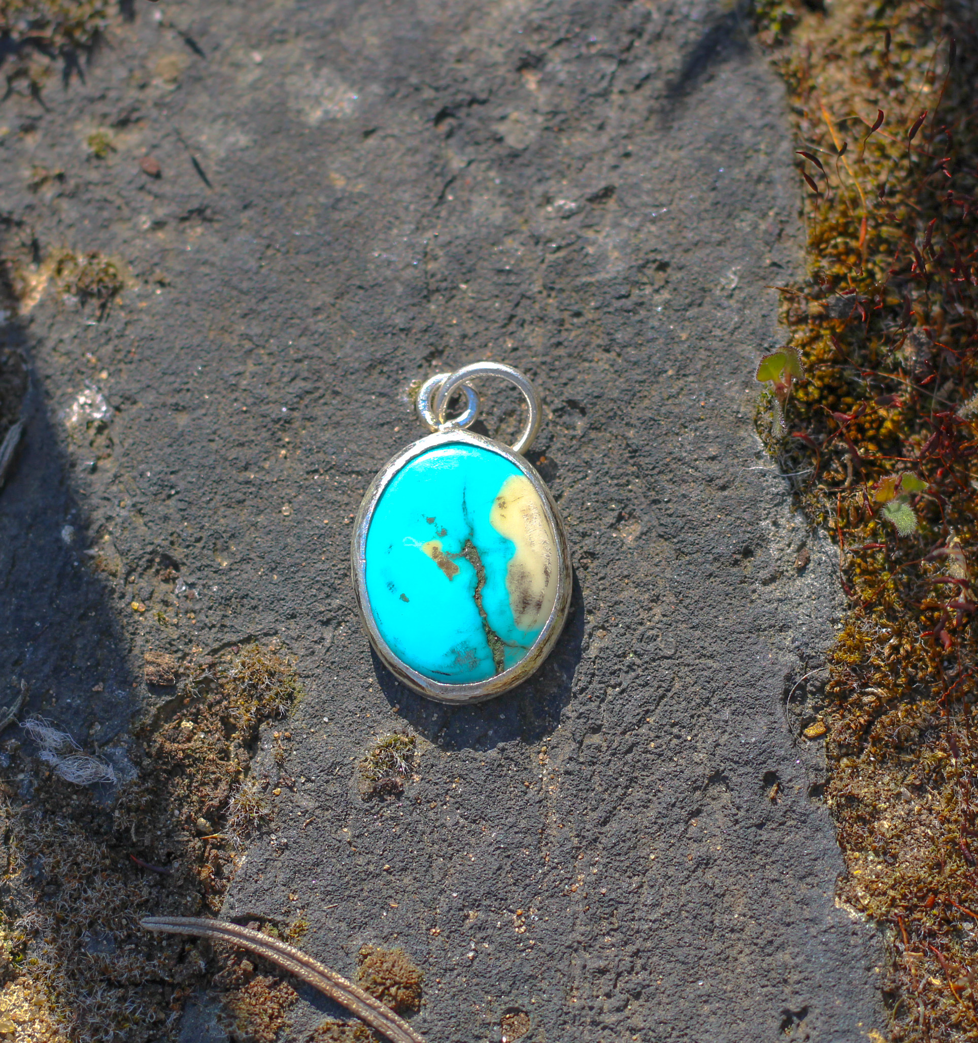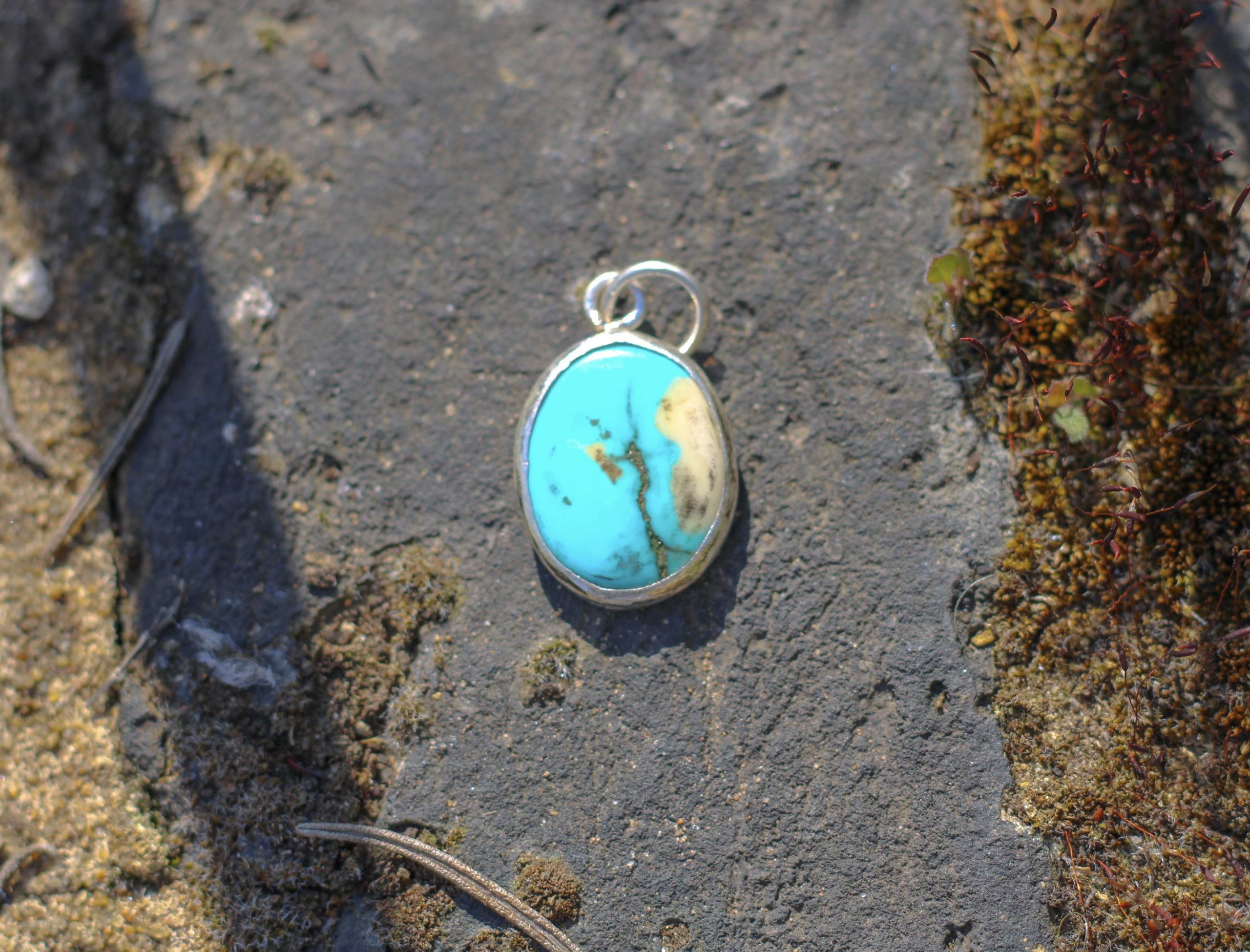 Magha Small Turquoise Pendant gemstone has combination of light blue, white, and natural gold pyrite hues. Perfect of a minimalistic look.