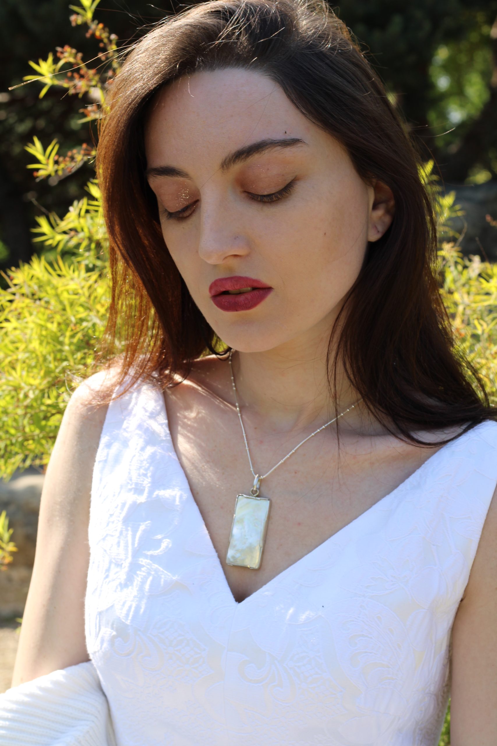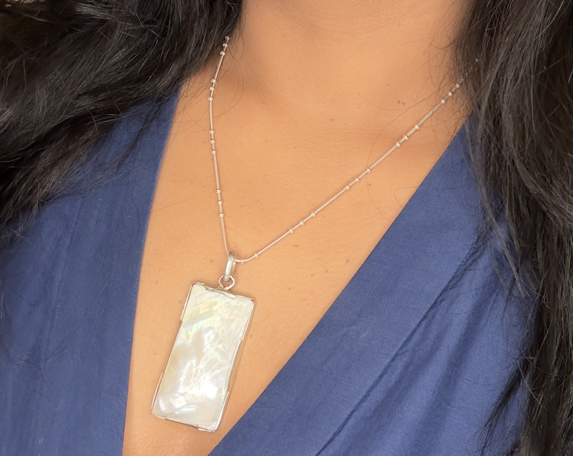 This beautiful Nacre or Mother of Pearl necklace is unique in it’s setting, size, and shape. Big rectangle shape has a striking appearance.