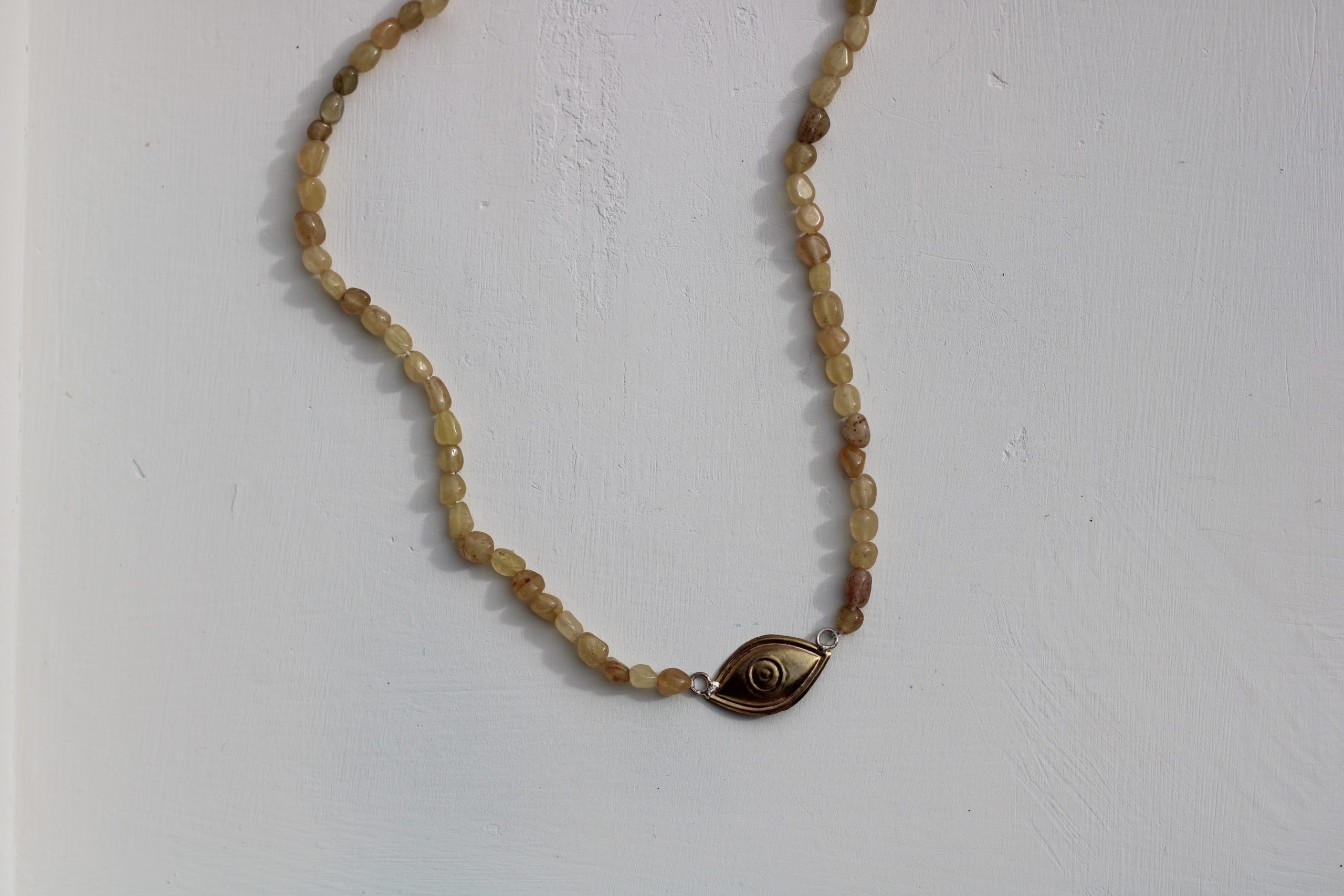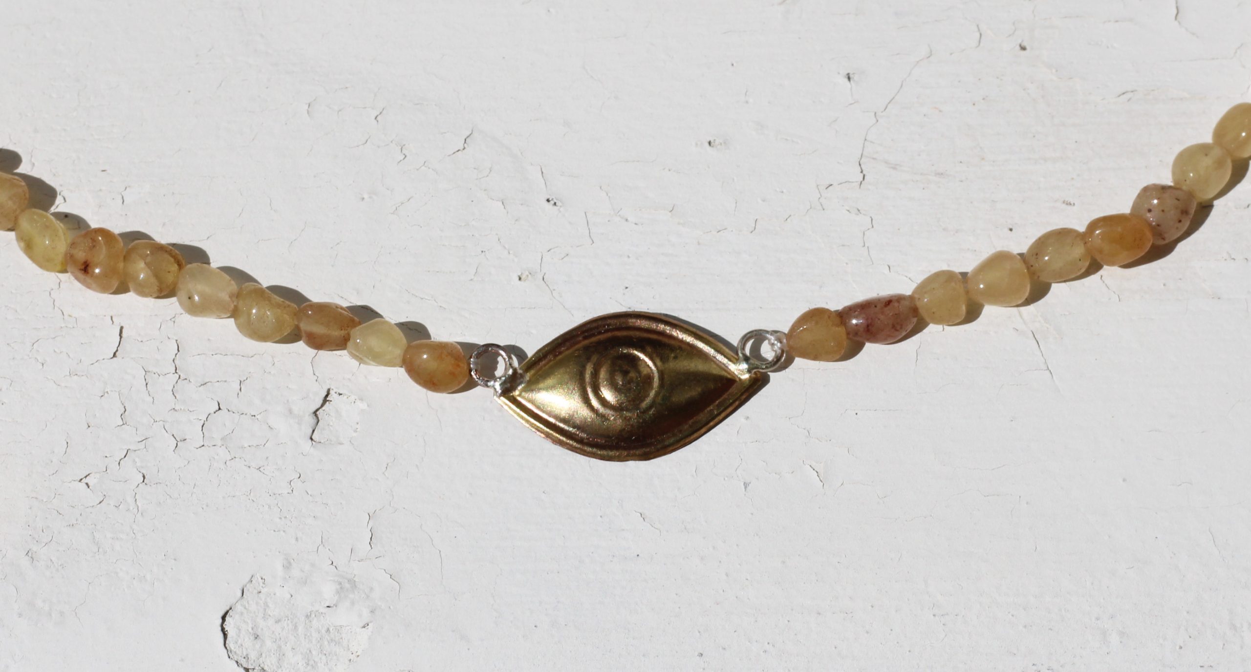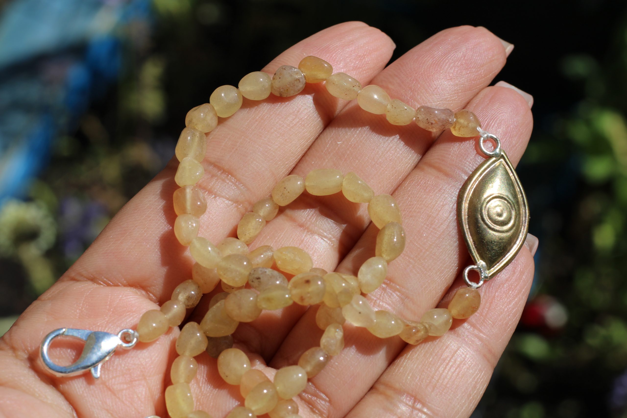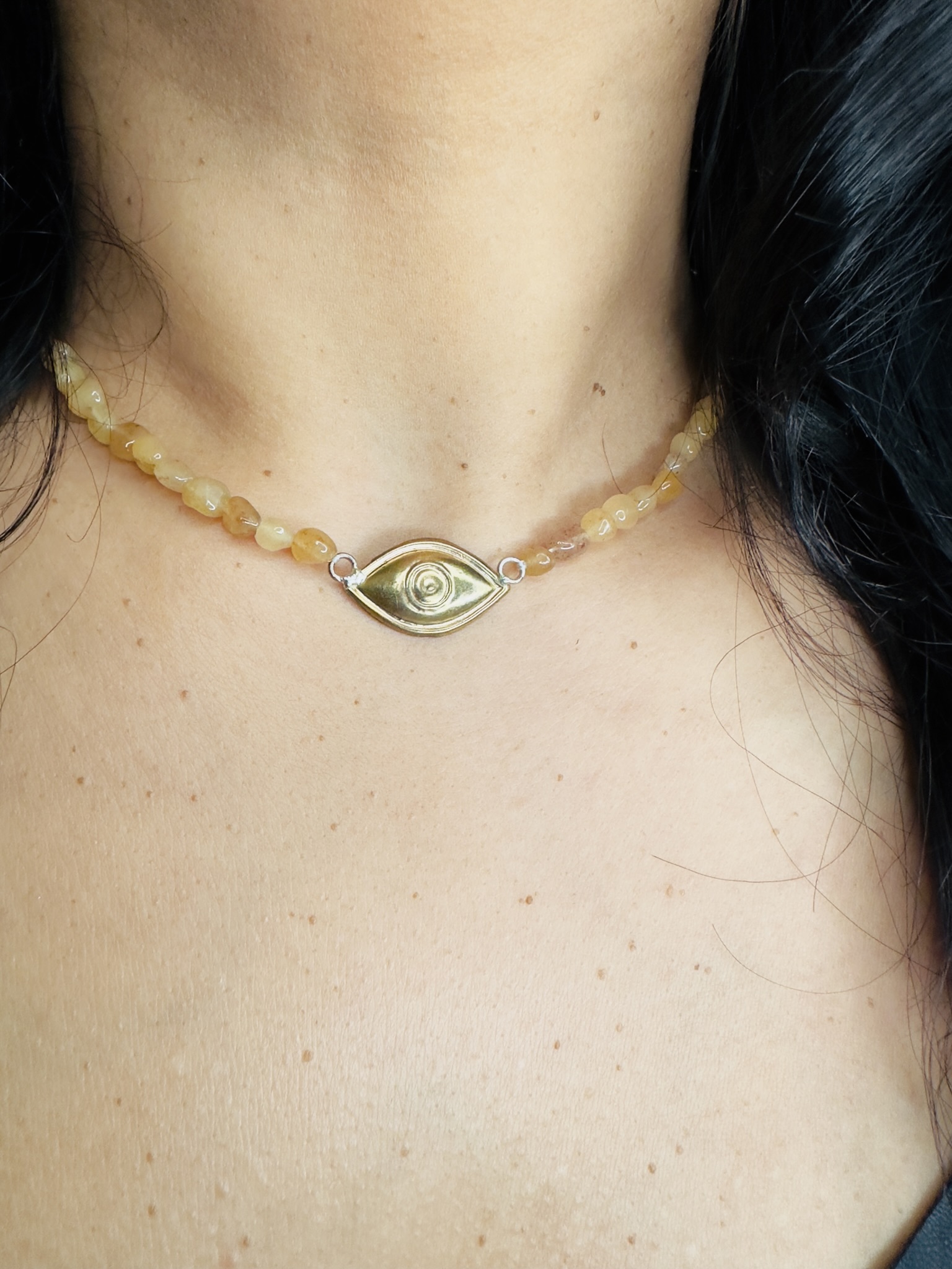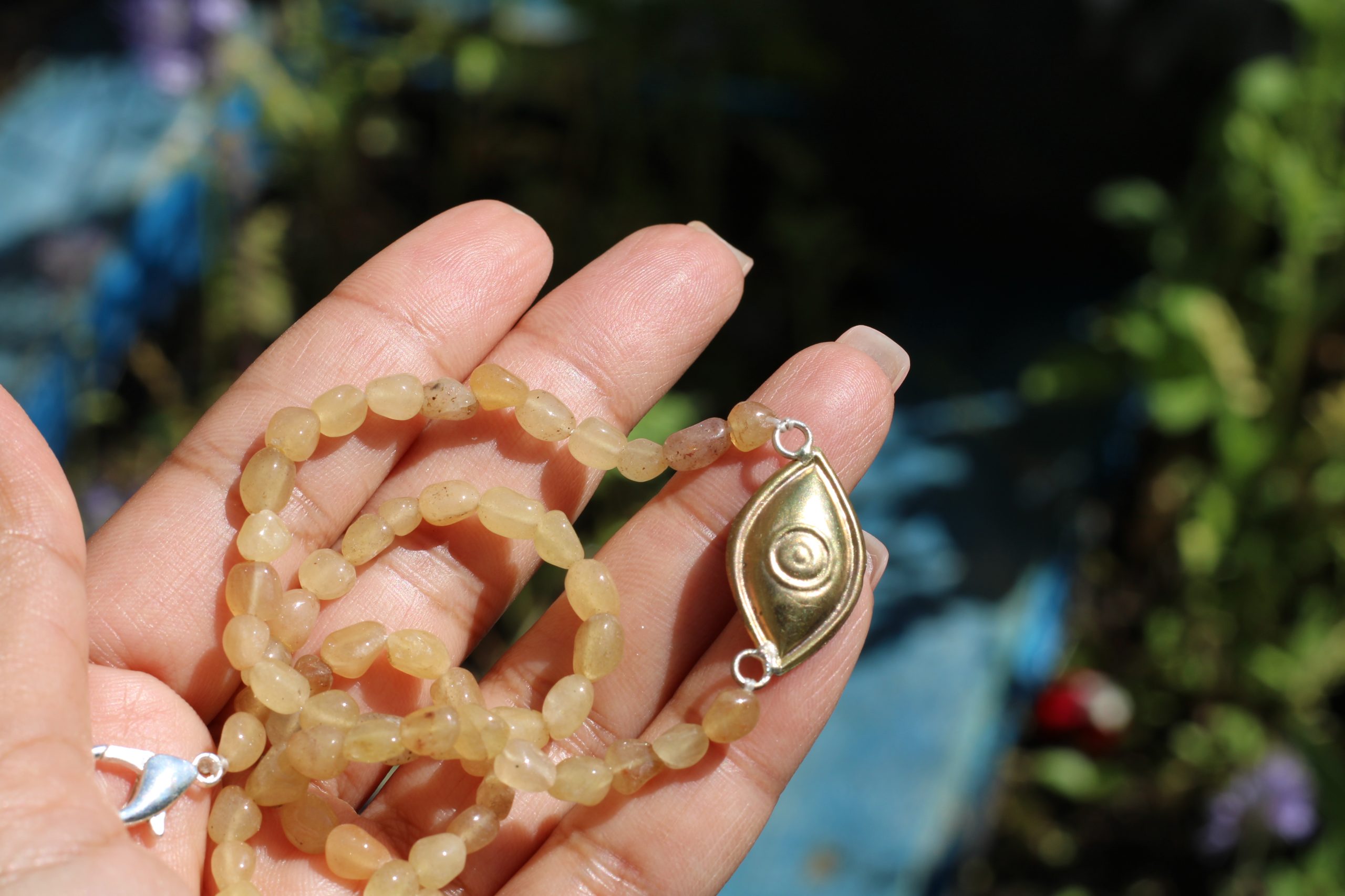 Nazar necklace with yellow stone beads and traditional Indian nazar (evil eye) charm which is believed to protect against evil eye. An evil eye is not always because of jealousy or bad intention. Read more about evil eye jewellery here.