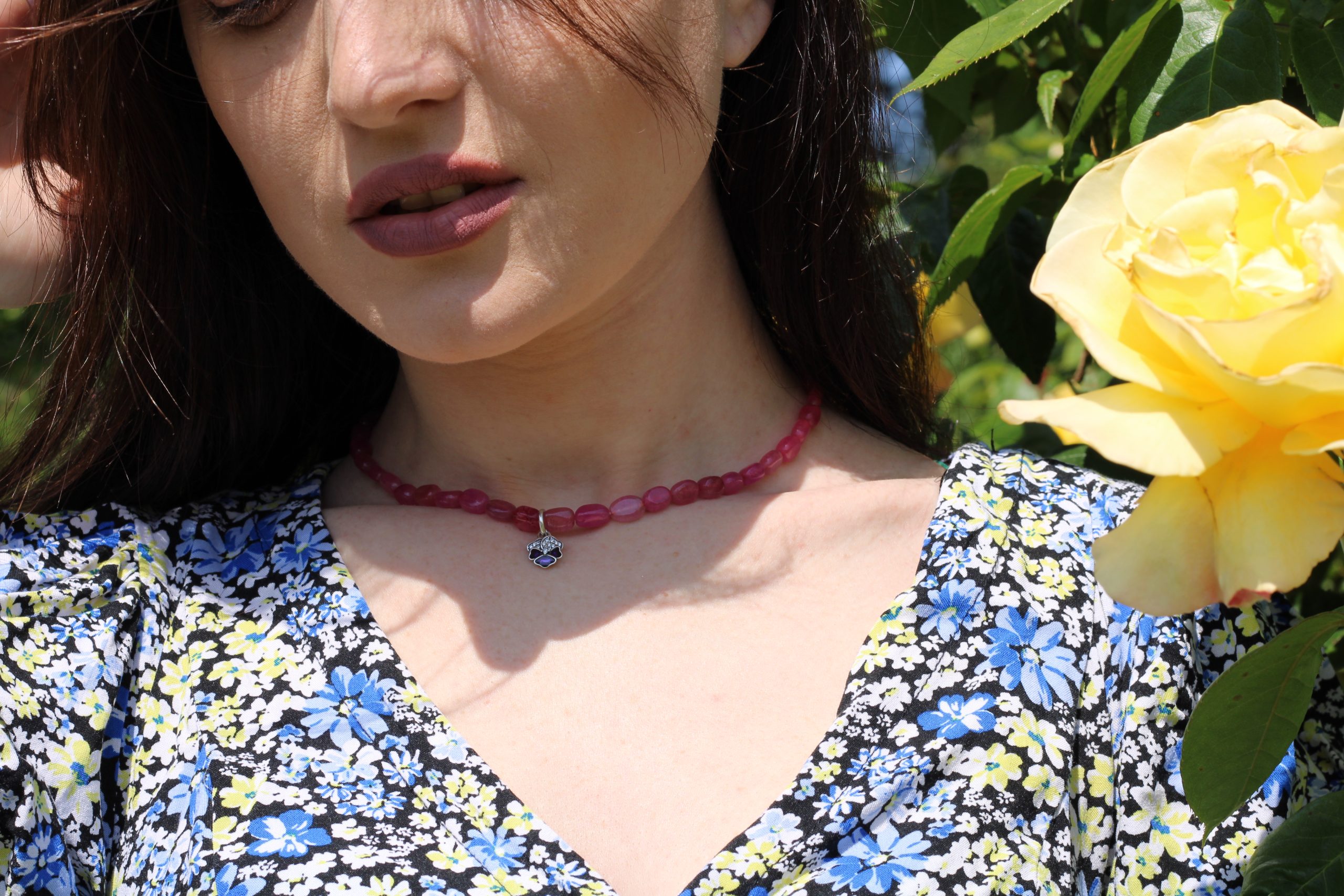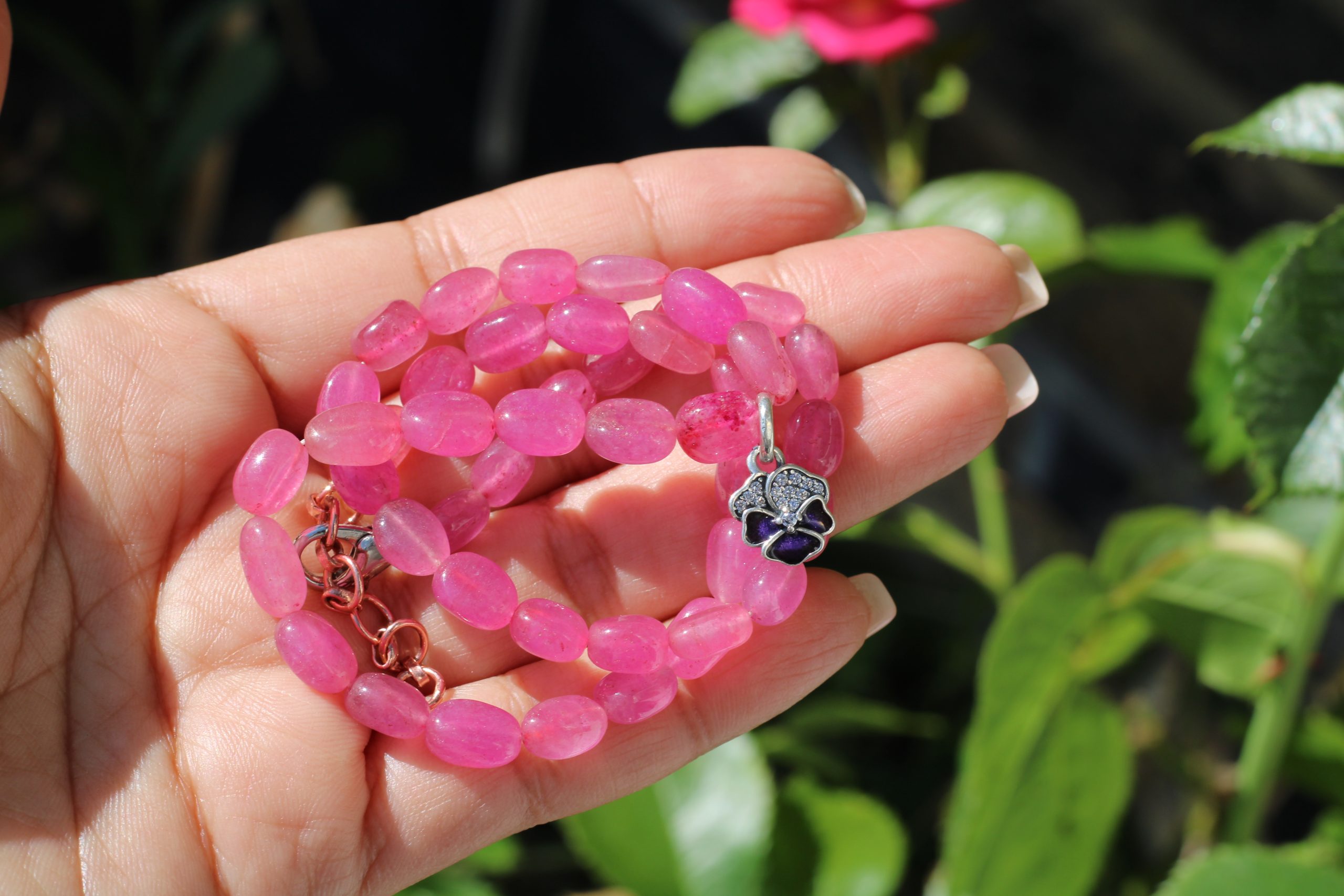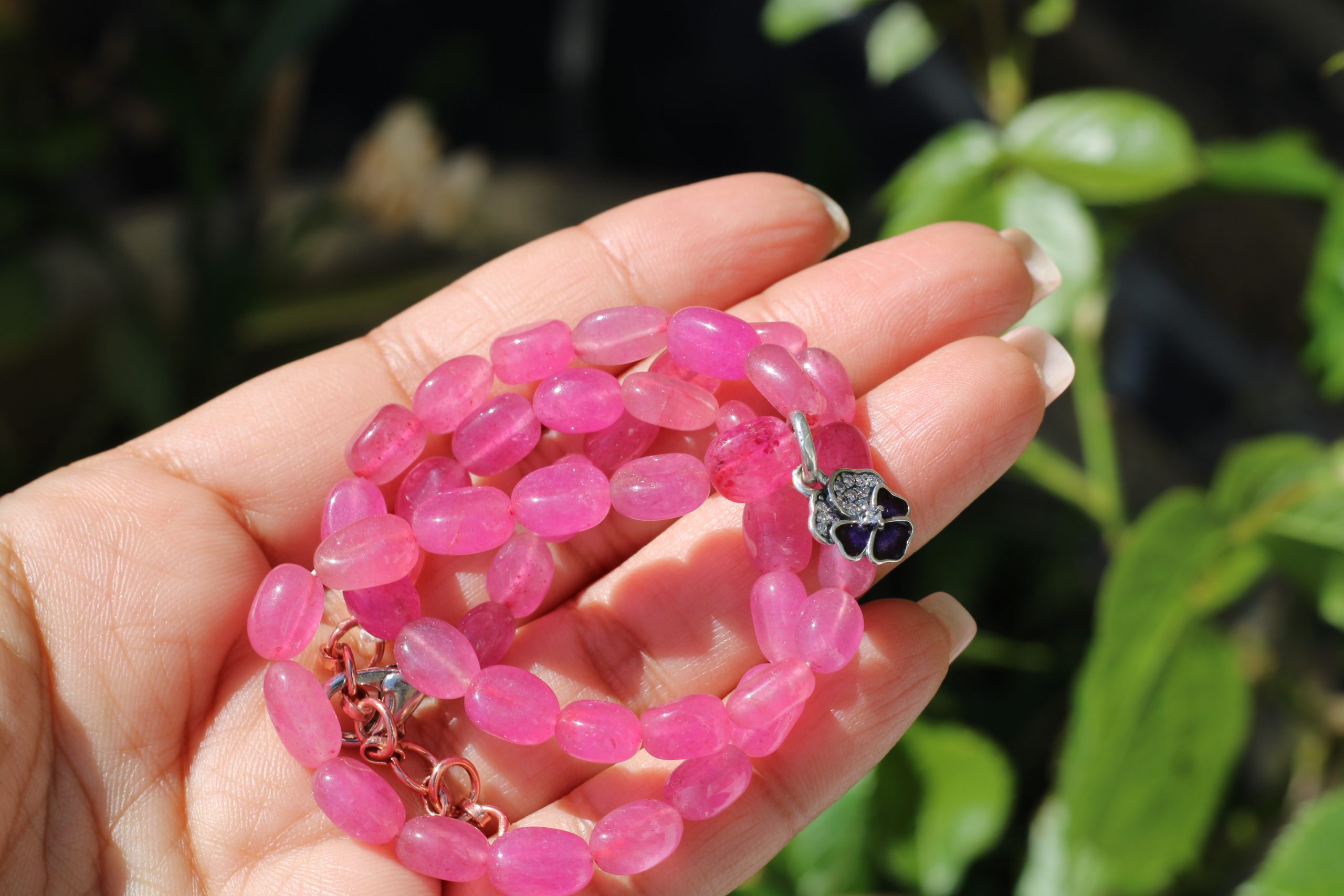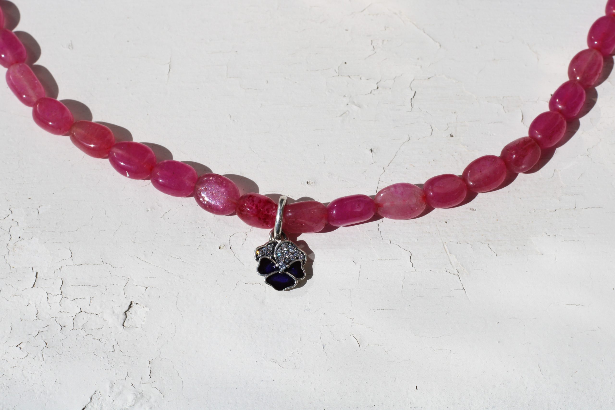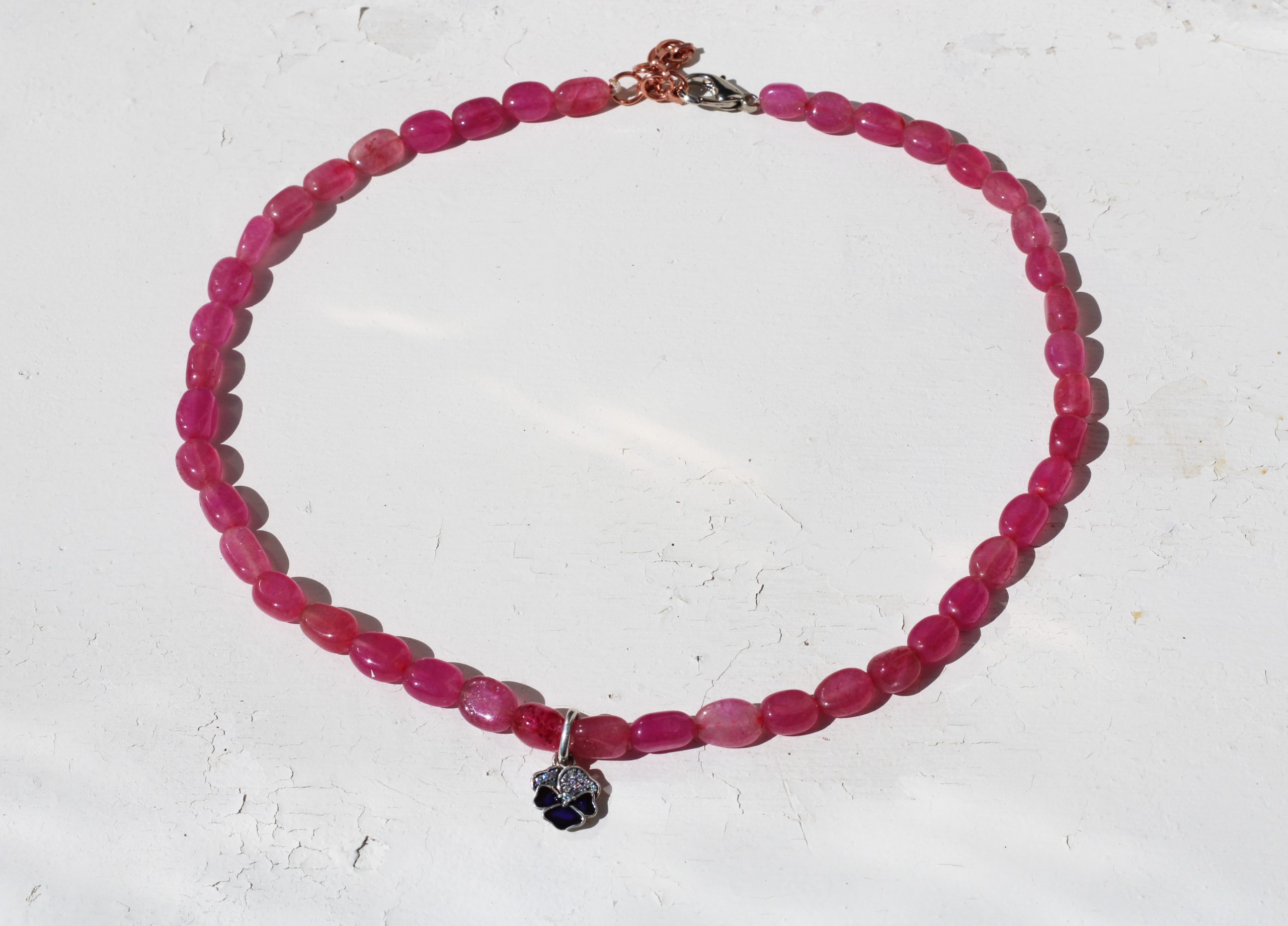 Paraa Blue Pansy Choker with a cute sterling silver pansy charm and gorgeous pink stone beads. Perfect for summer. Pansy flowers are traditionally seen as symbols of love – both romantic and platonic. In Victorian floriography, pansies often represented forbidden love between secret lovers. Symbolism makes it a very meaningful gift for new lovers.