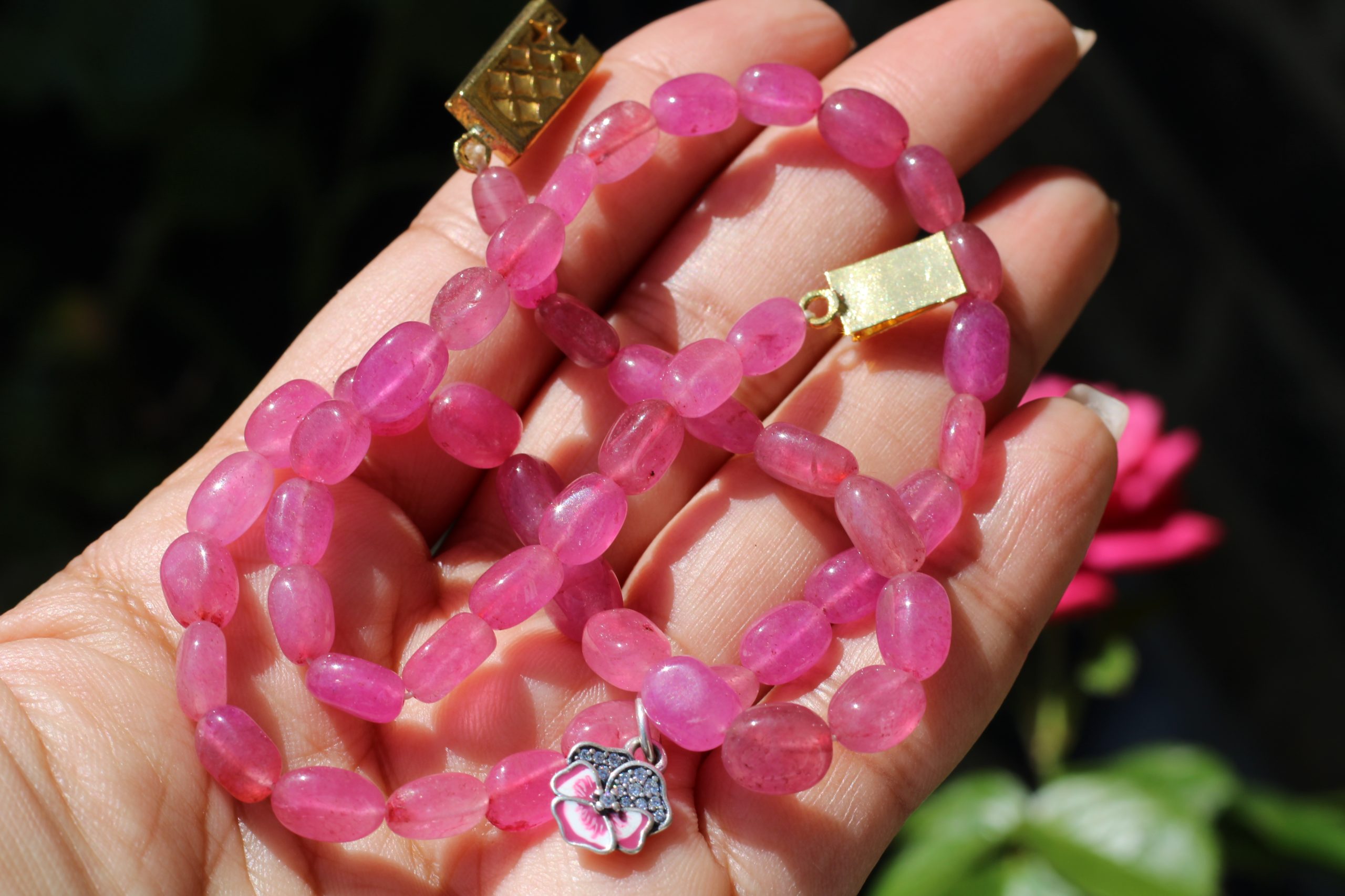 Paraa Pink Pansy Choker with a cute sterling silver pansy charm and gorgeous pink stone beads. Perfect for summer. Pansy flowers are traditionally seen as symbols of love – both romantic and platonic. In Victorian floriography, pansies often represented forbidden love between secret lovers. Symbolism makes it a very meaningful gift for new lovers.