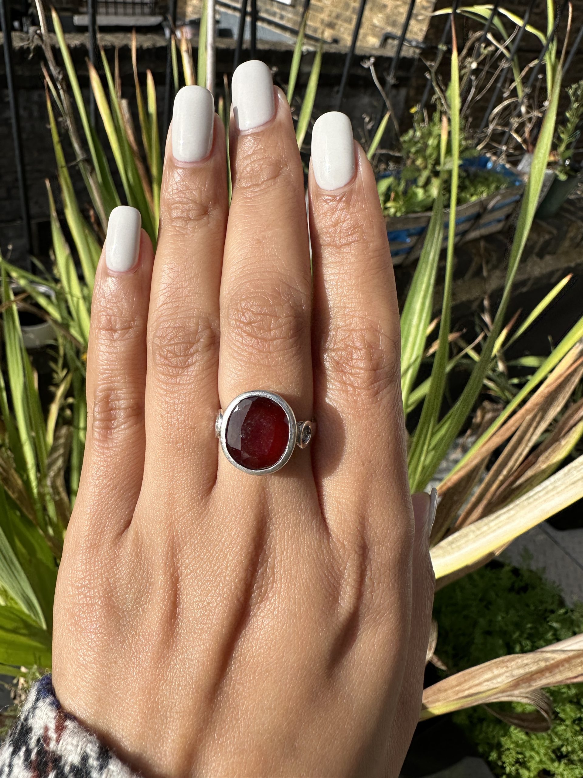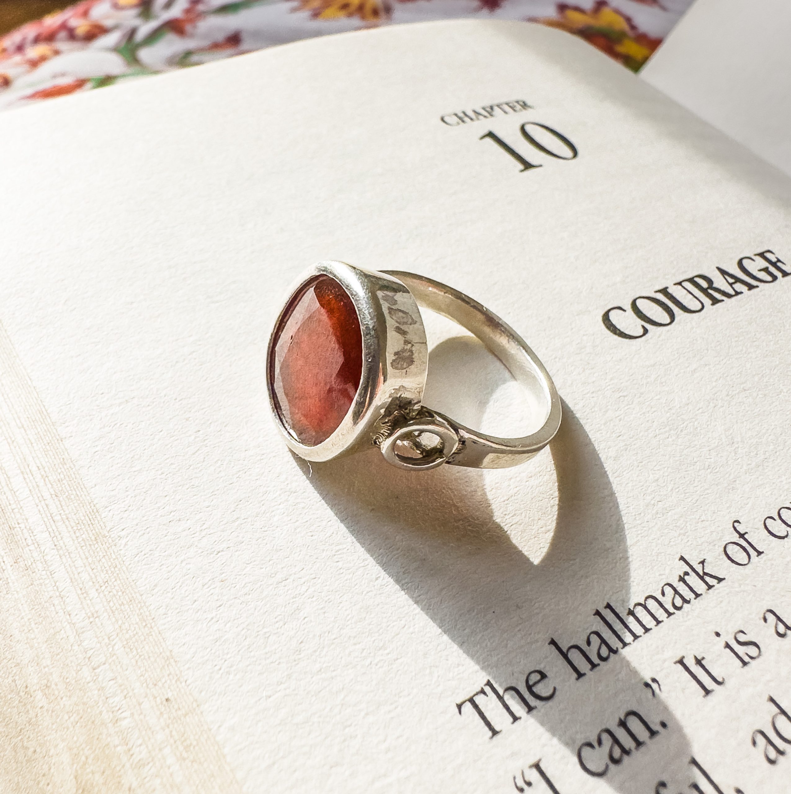 Rasya Oval Garnet Ring Silver handmade in sterling silver with a central vivid honey colored garnet stone. Hessonite Ring is in chunky silver style, best to use as a cocktail ring.