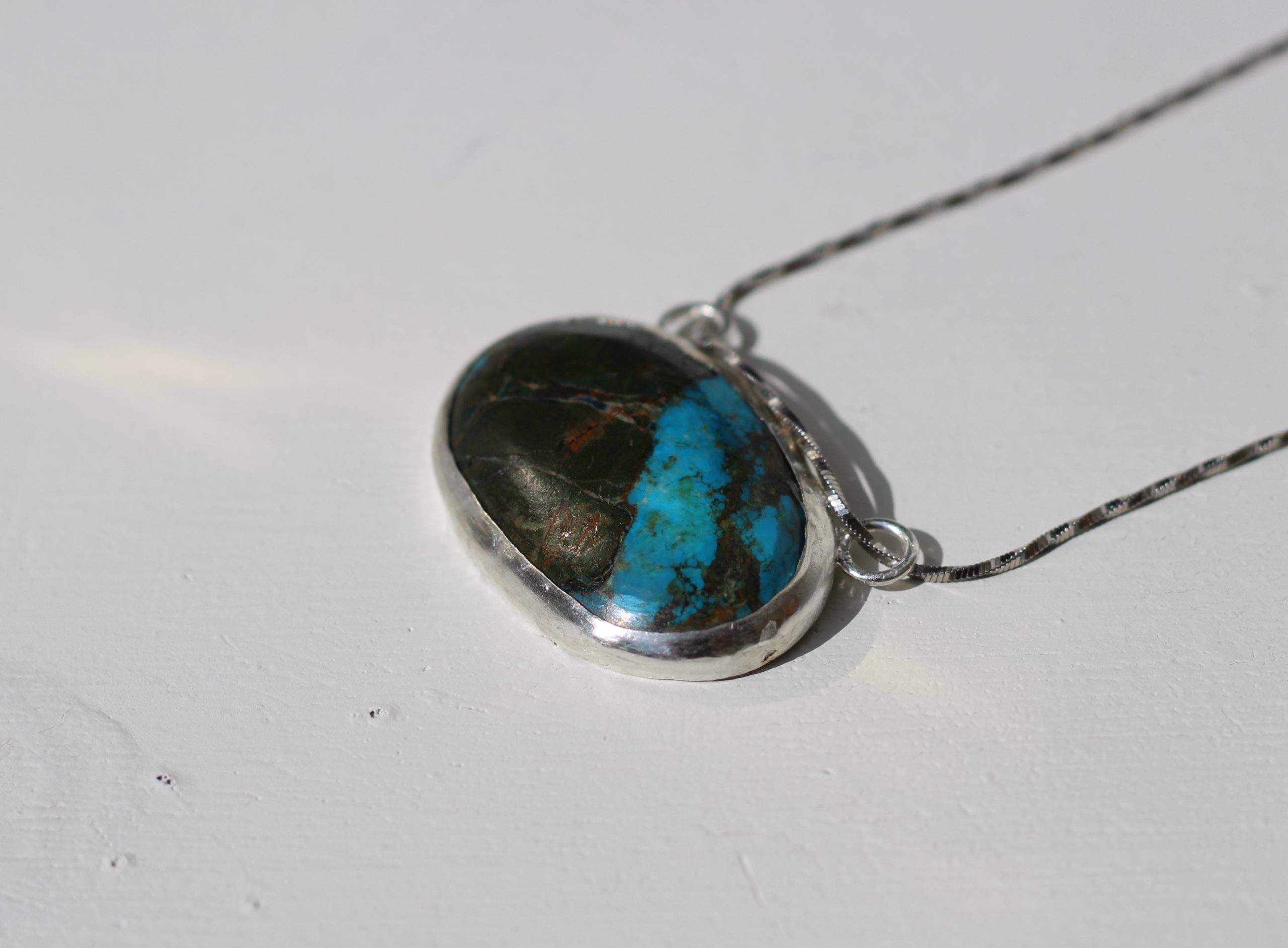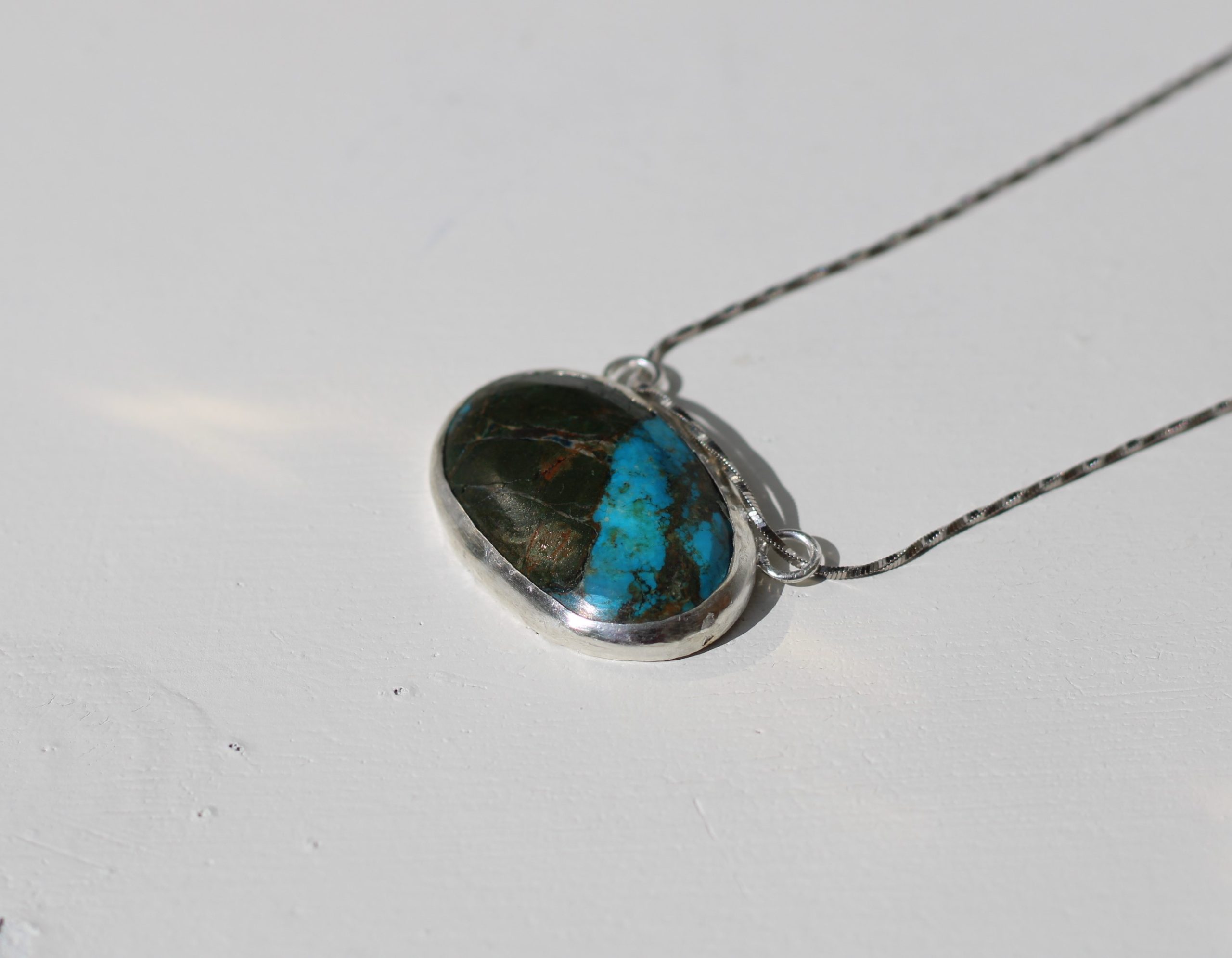 Revati Tibetan Turquoise Necklace with a gorgeous Tibetan turquoise gemstone. Pendant comes with an 18in designer sterling silver chrome polished chain.