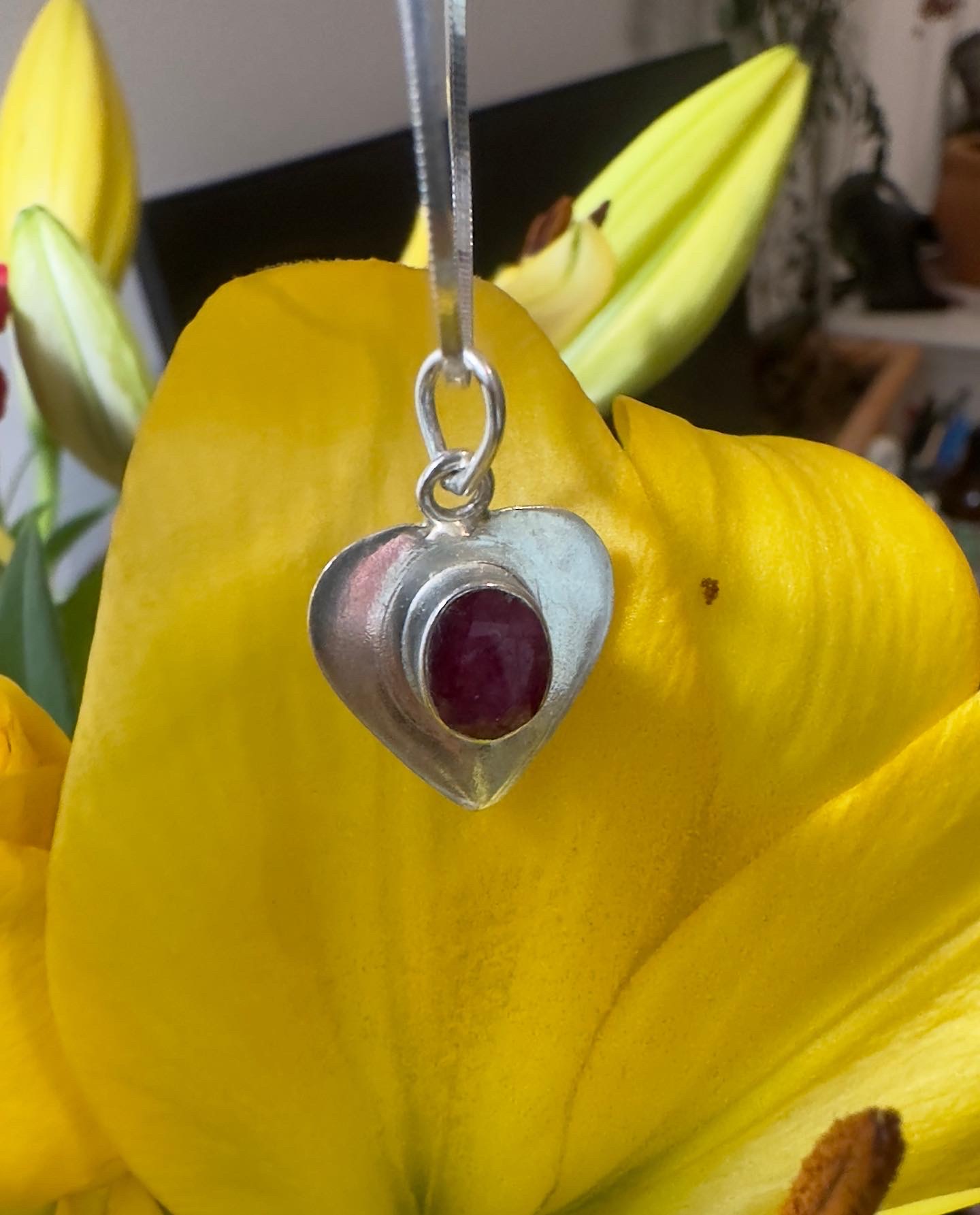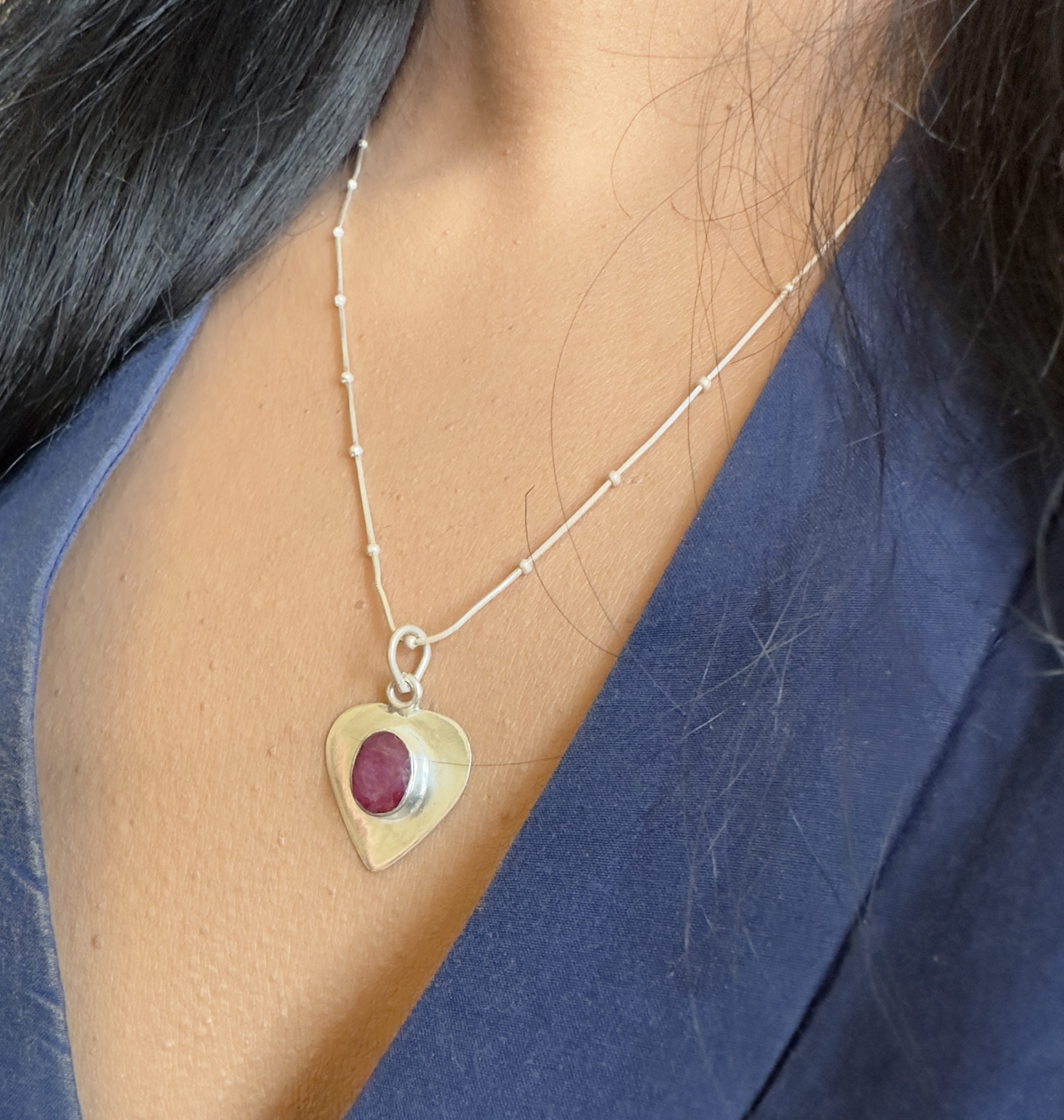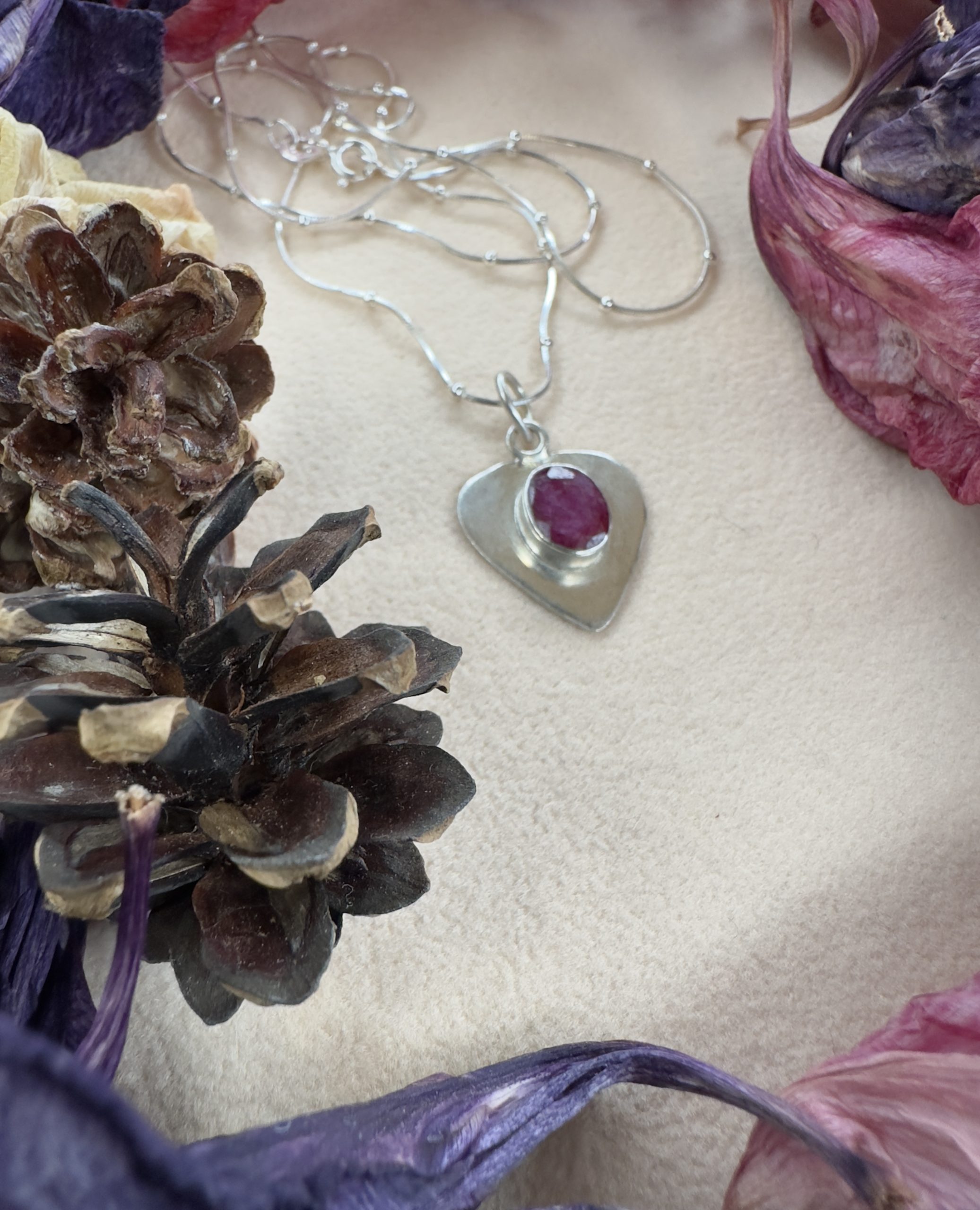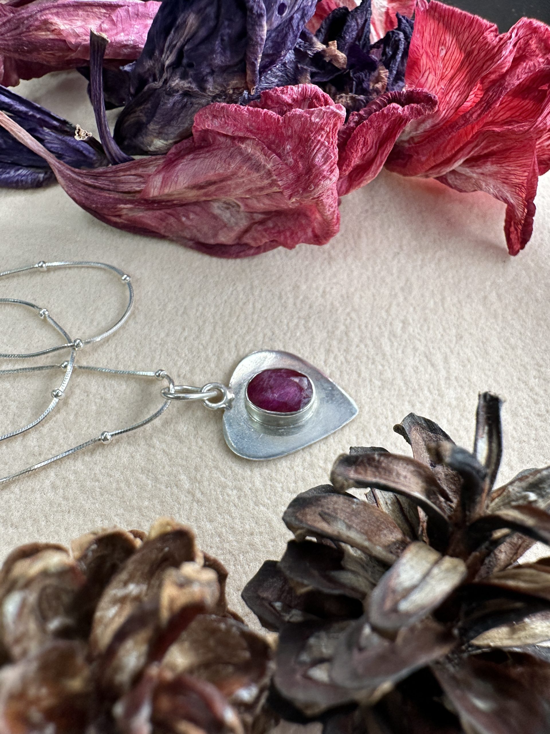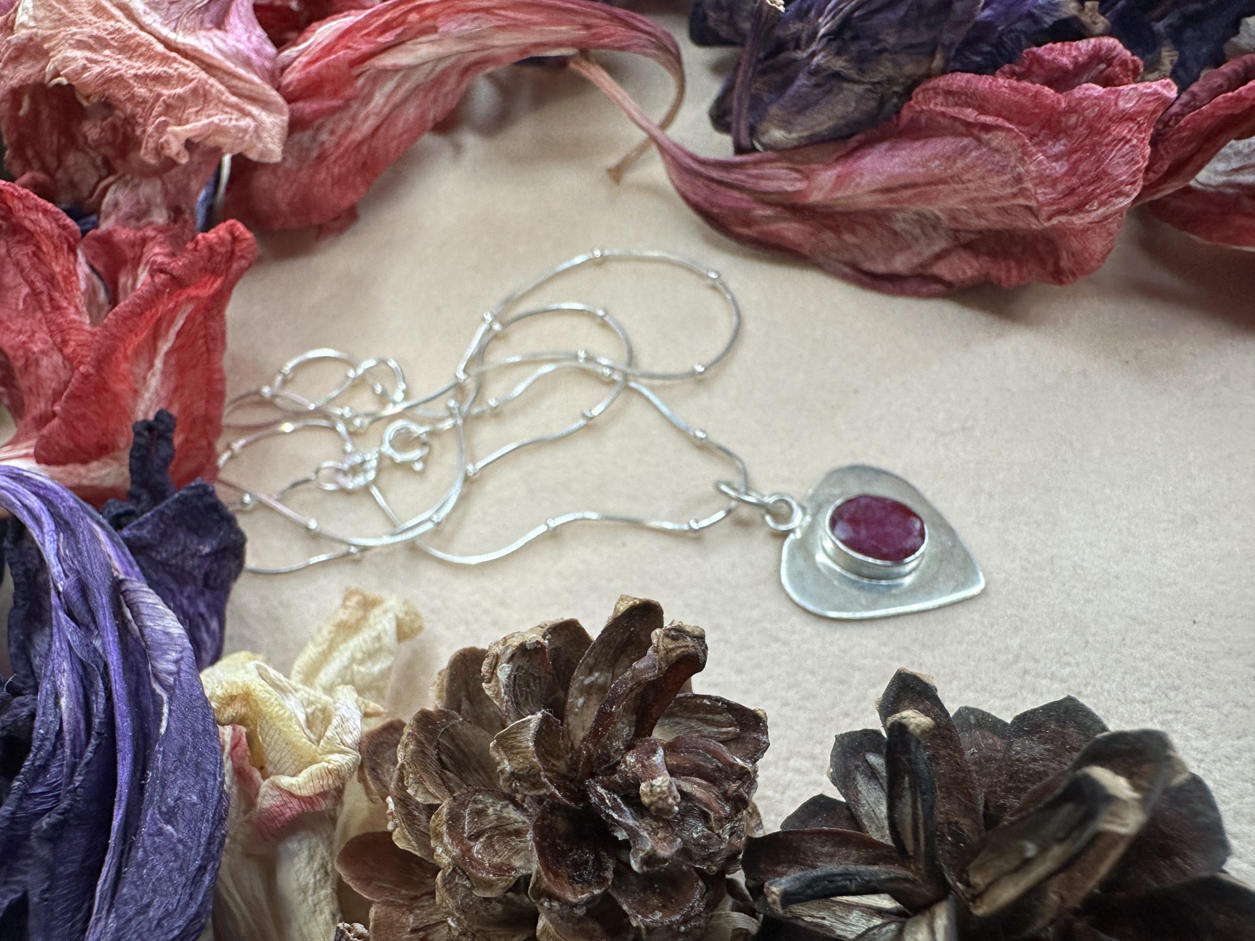Fall in love with the stunning handmade Raw Ruby Heart Charm Pendant Necklace. This beautiful piece features a gorgeous heart-shaped ruby charm, delicately suspended from a dainty 20-inch silver chain. The minimalistic design of the necklace is both elegant and understated, making it the perfect accessory for everyday or occasion wear. The bright red ruby heart is a symbol of love and romance, making this necklace the perfect choice for Valentine’s Day or any special occasion where love is being celebrated. With its unique and one-of-a-kind design, the Ruby Heart Charm Pendant Necklace is sure to become a cherished keepsake. Only one bespoke piece was carefully handcrafted to ensure the highest quality, and its subtle beauty is sure to catch the eye of those who appreciate the finer things in life. Ruby is also believed to stimulate the navel or Manipura Chakra, minimize self-doubt, making it the perfect piece to wear when seeking or expressing love.
