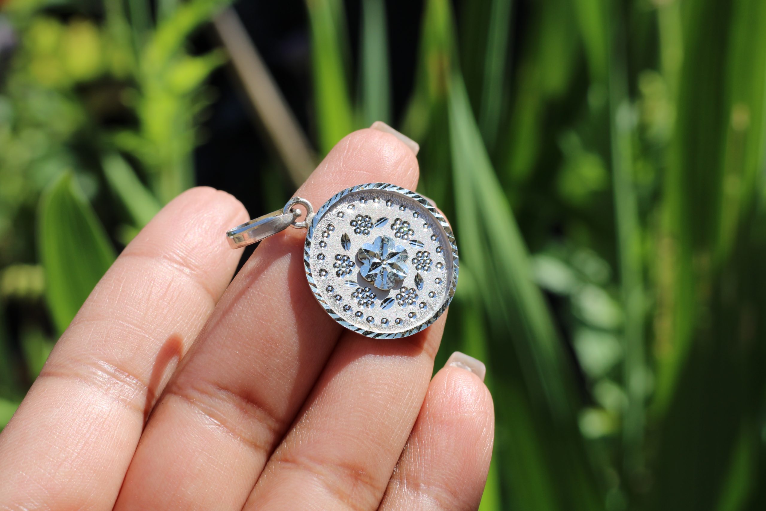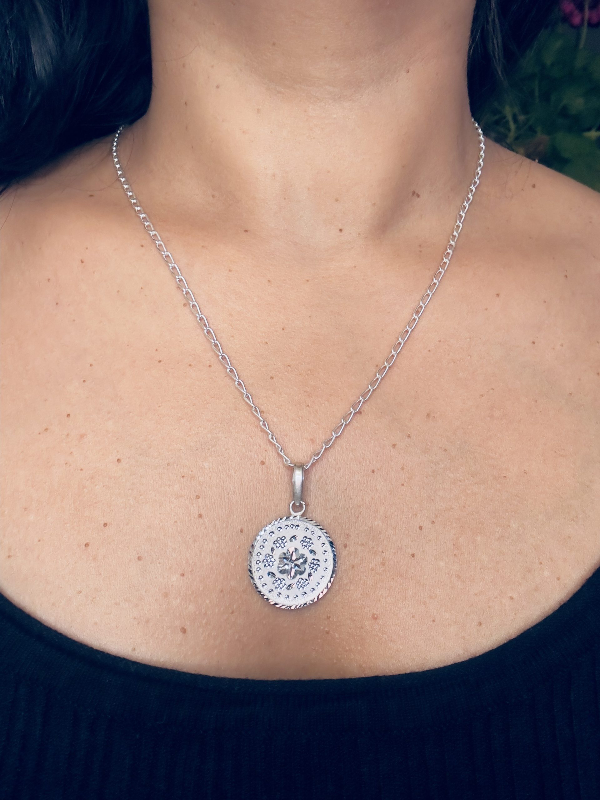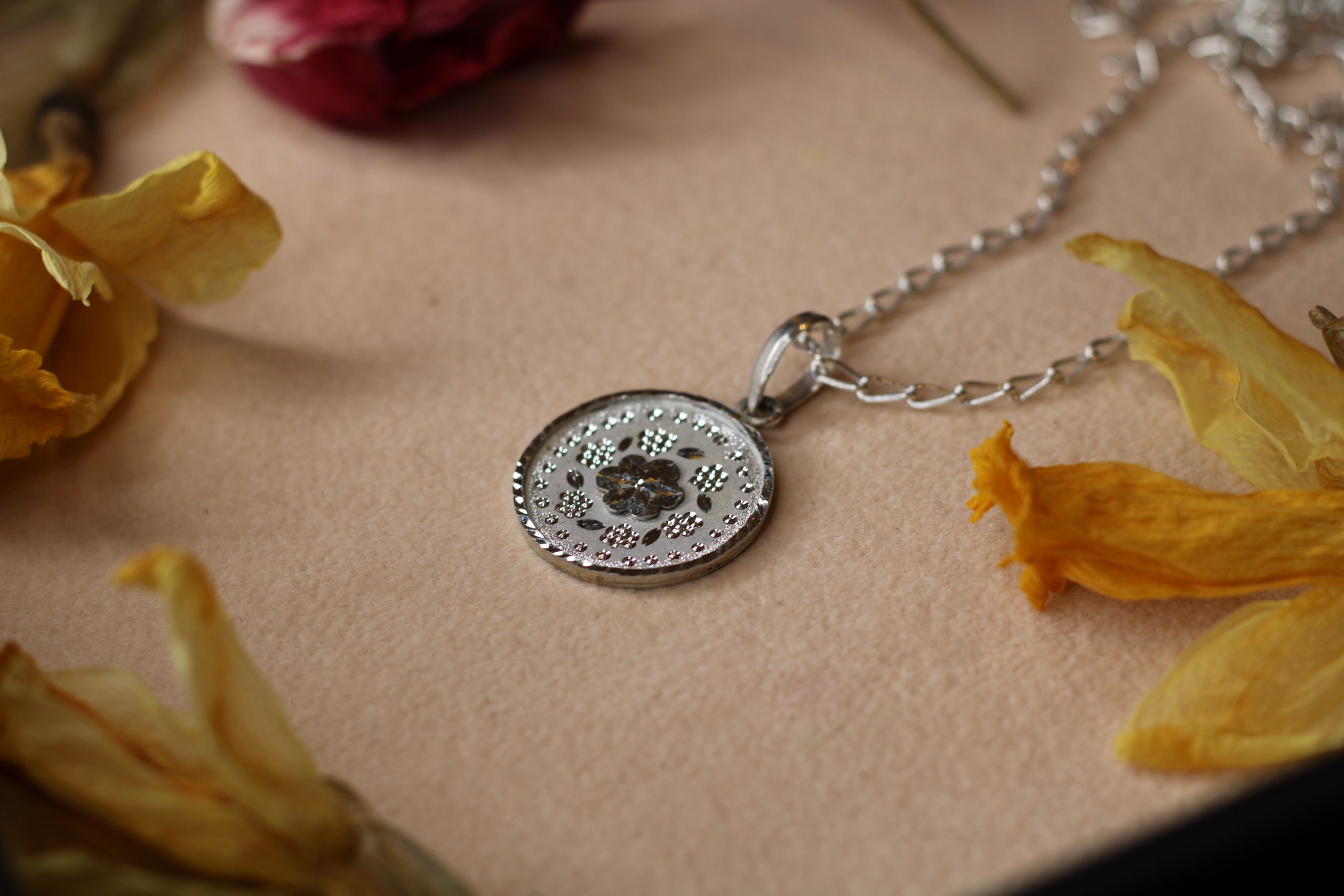 Coin Necklace with handcrafted silver coin pendant with traditional Indian Daisy flower design.