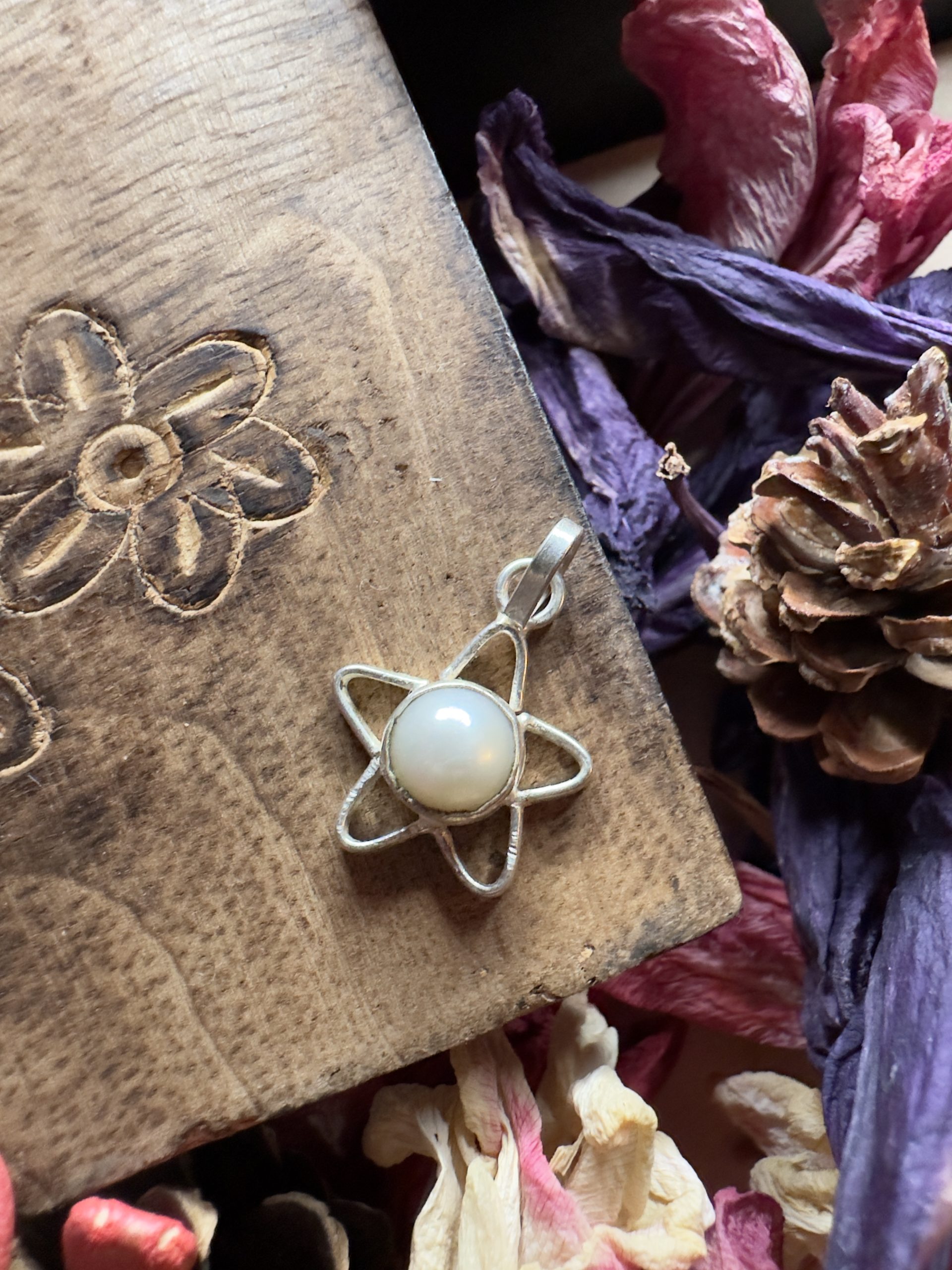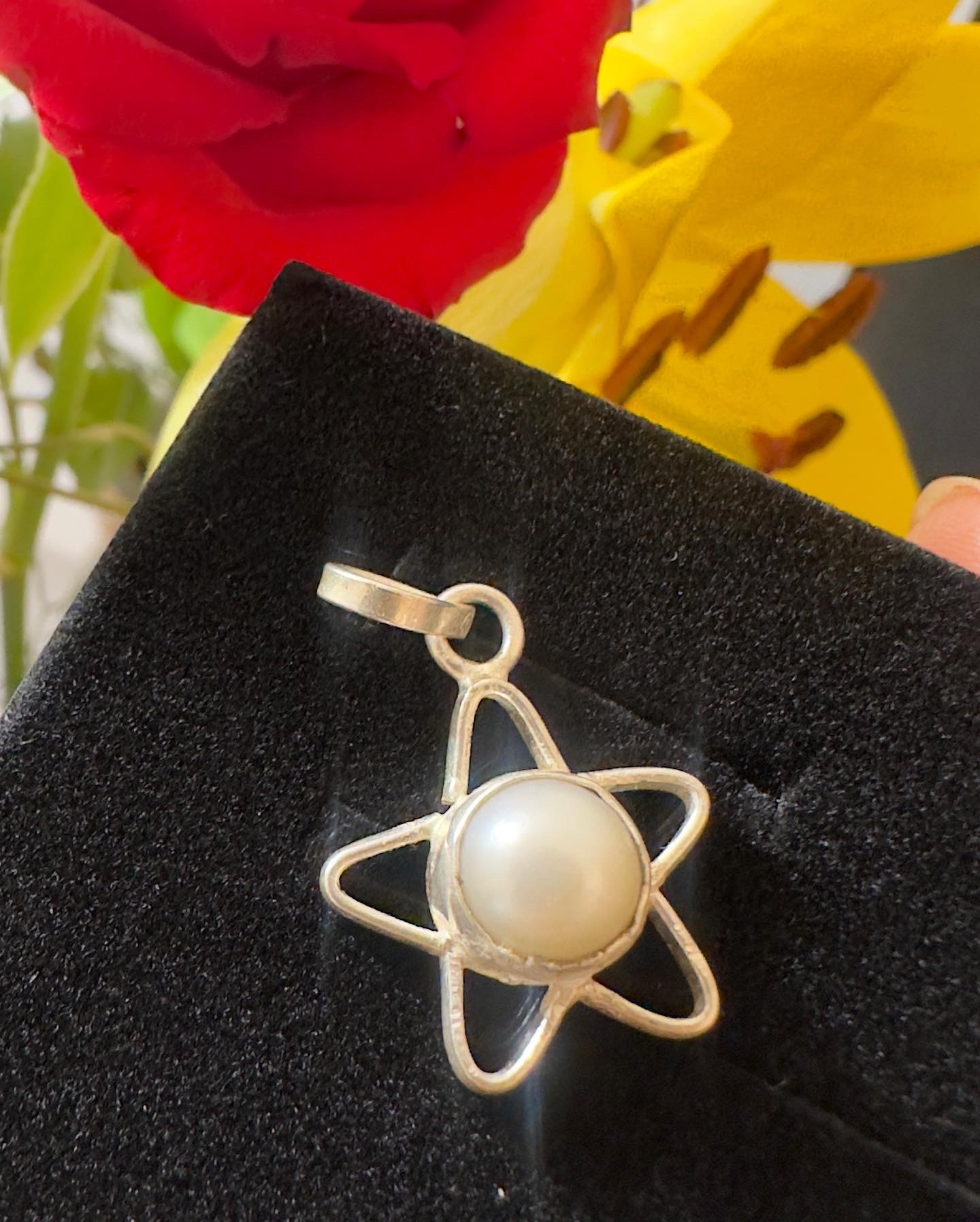 A silver star pendant with Pearl at the center for a soft romantic detail to your outfit. This necklace will make a perfect layering piece or it can be worn alone to compliment any outfit. A unique piece which no one else will have as we have only made one.