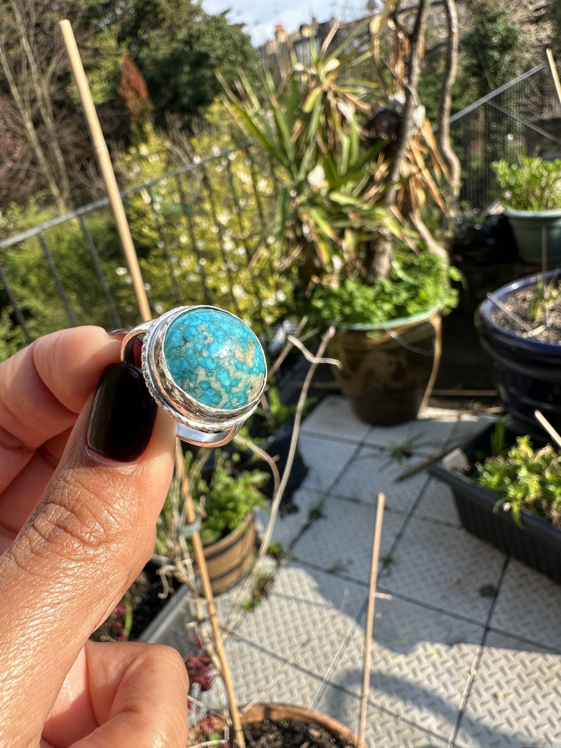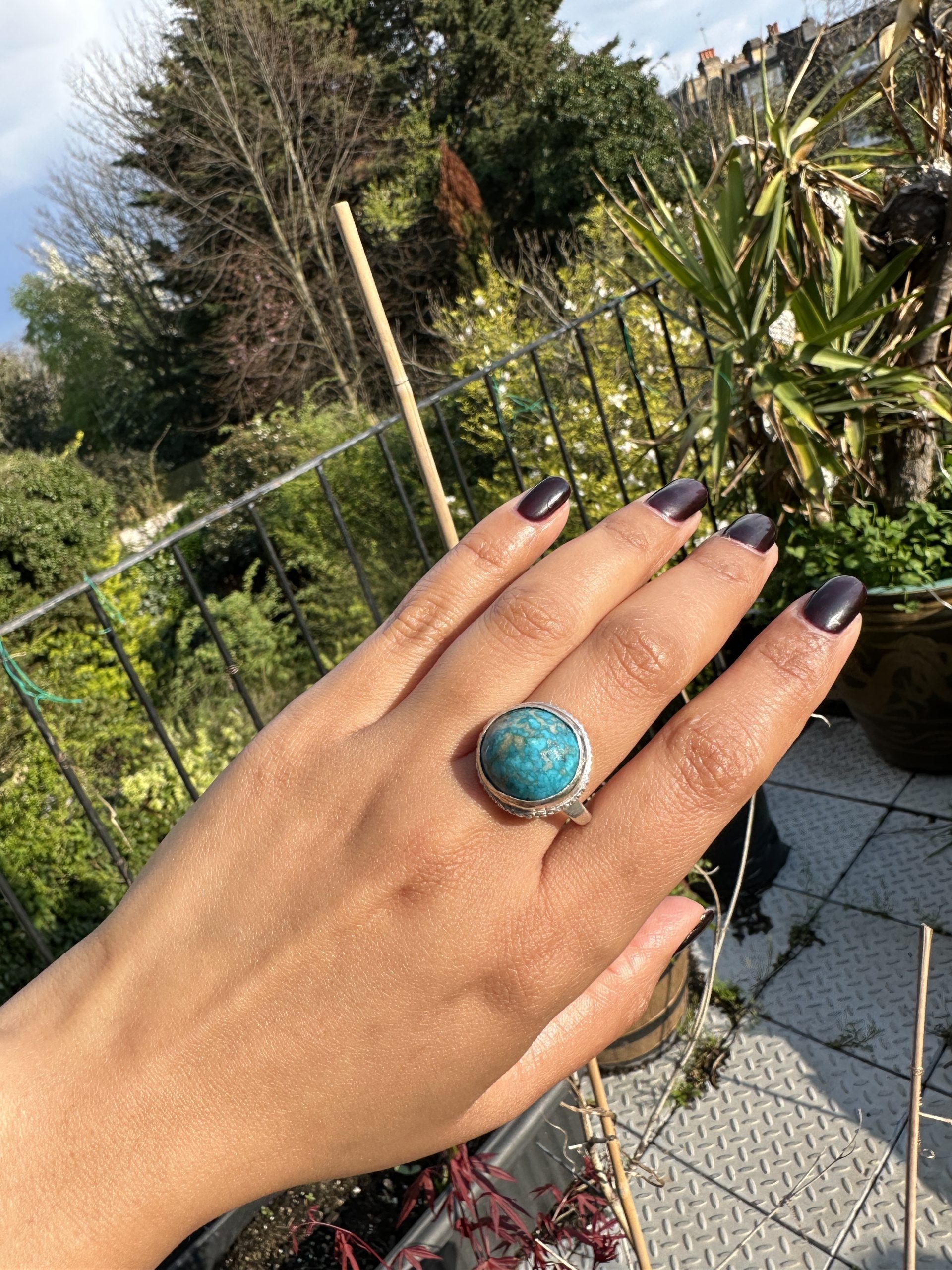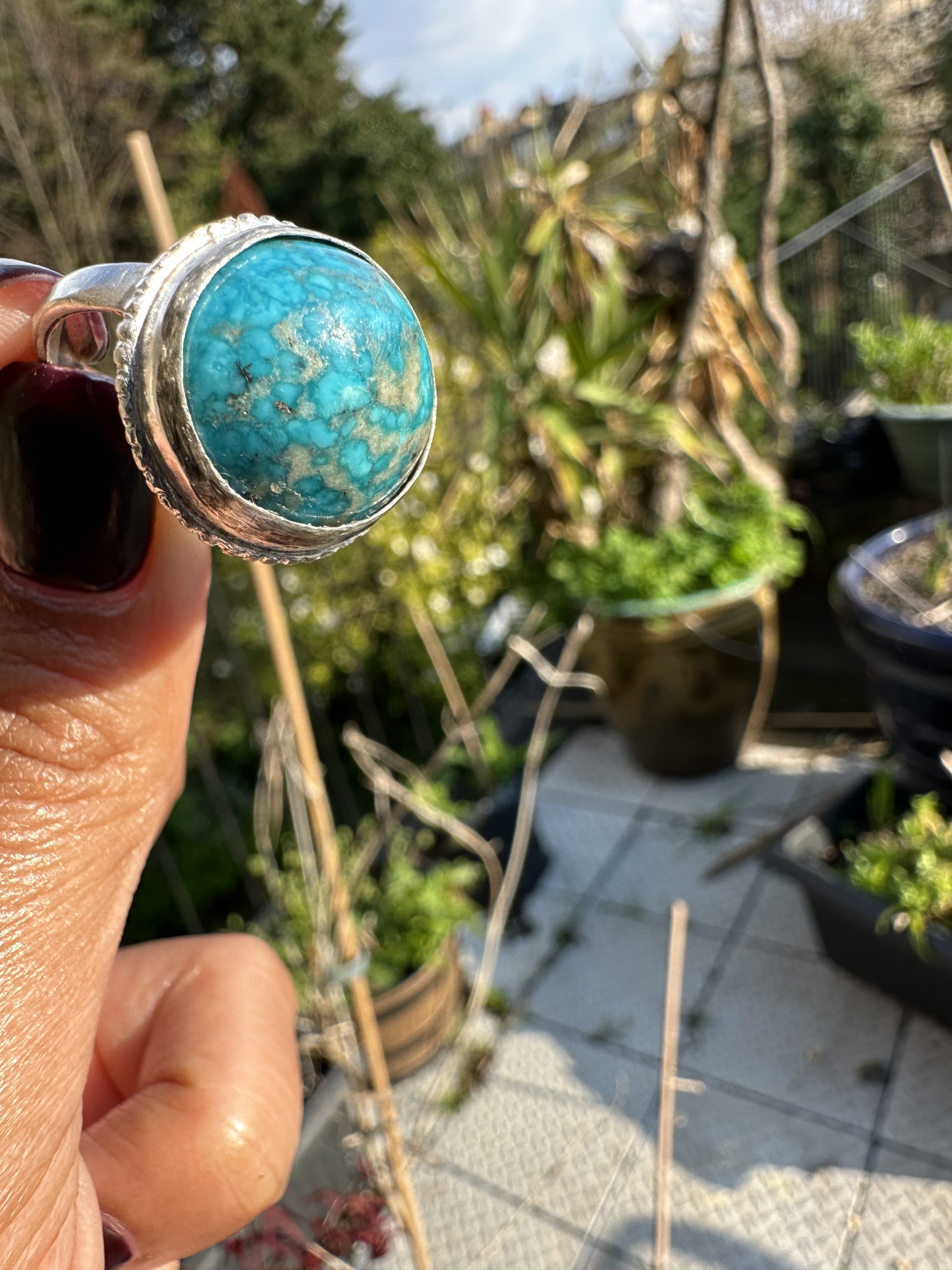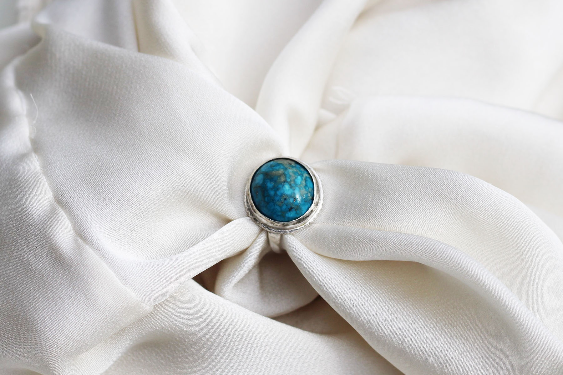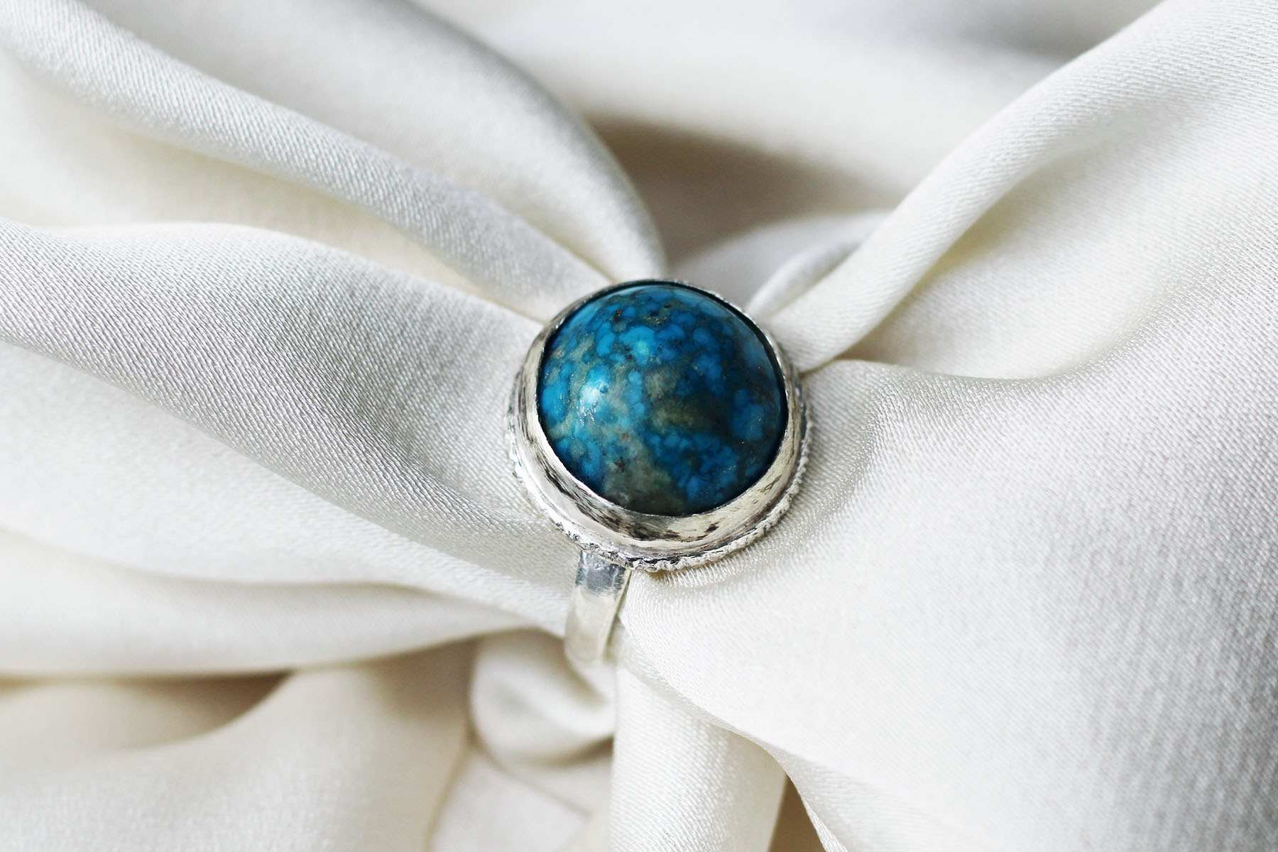 Bring the beauty of the earth to your jewelry collection with this vivid and bright Astika Turquoise Ring with Natural Pyrite, set in Sterling Silver. This unique piece features a natural round stone from the famous Neyshabur Firuzeh region, with ocean blue coloring, set in gleaming sterling silver and naturally accented with sparkling fool’s gold pyrite. Gorgeous rare stone resembles earth shot from a satellite with different shades of sea and ground visible. Bohemian elegance making this ring the perfect accessory for any occasion.
