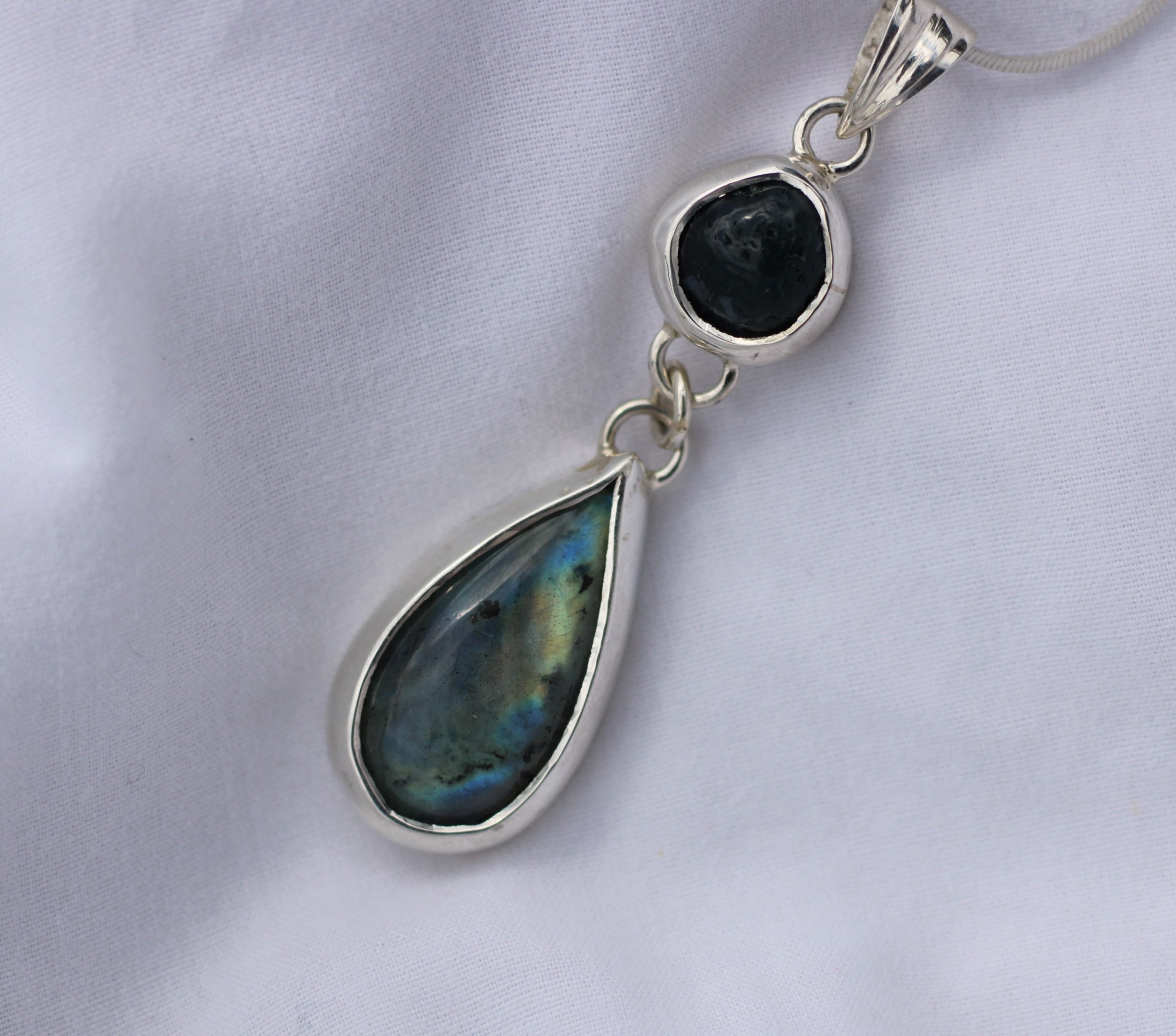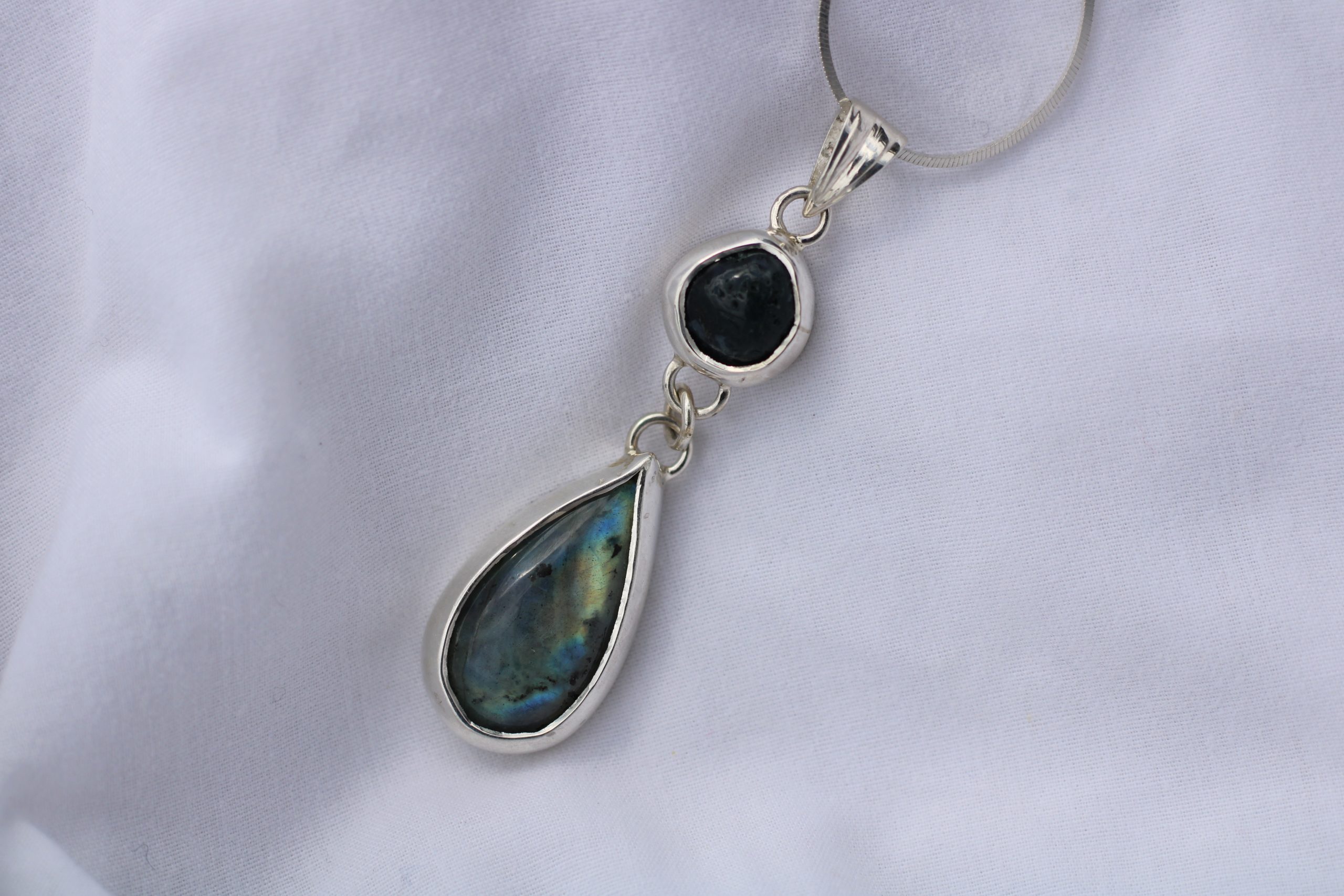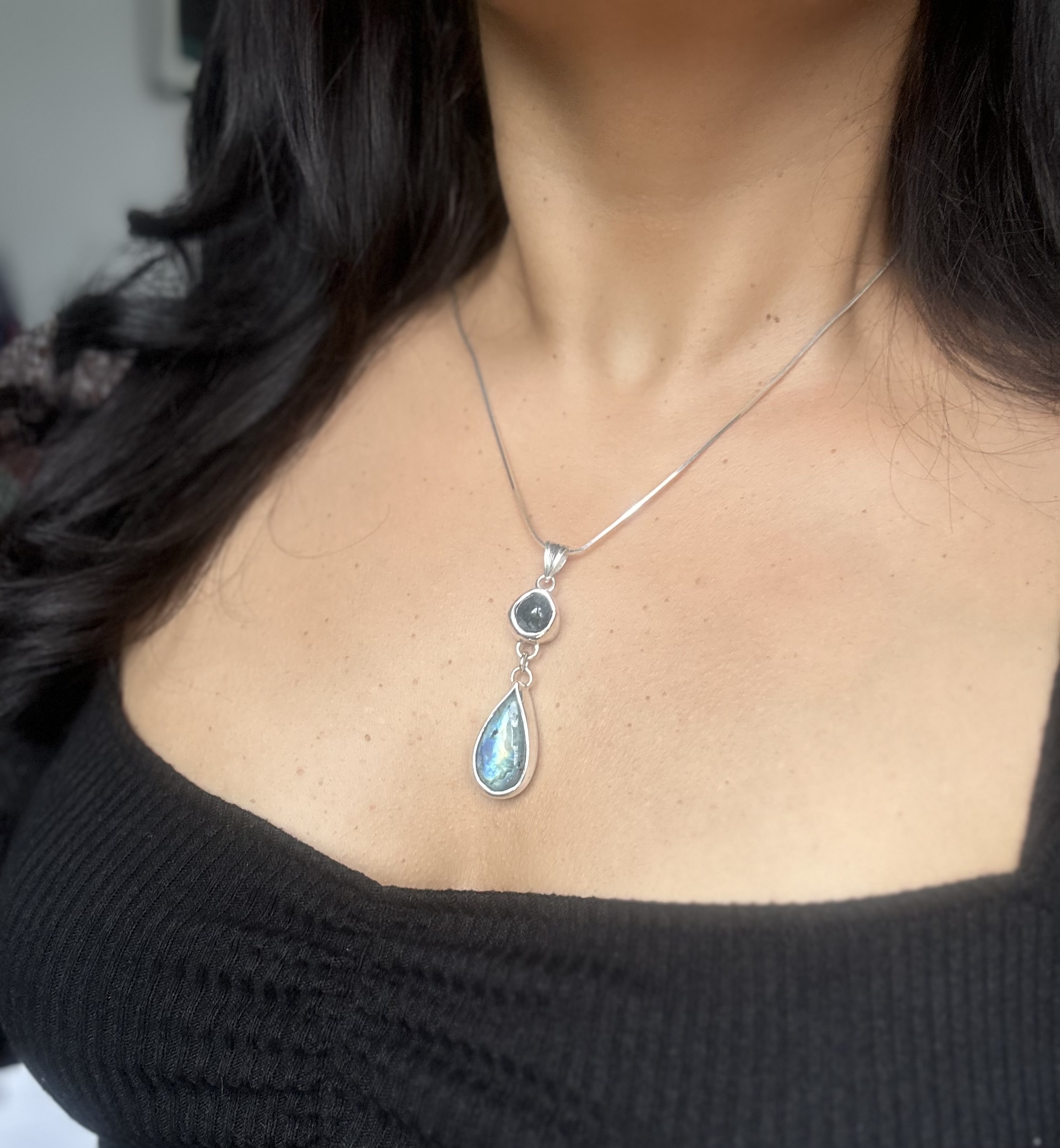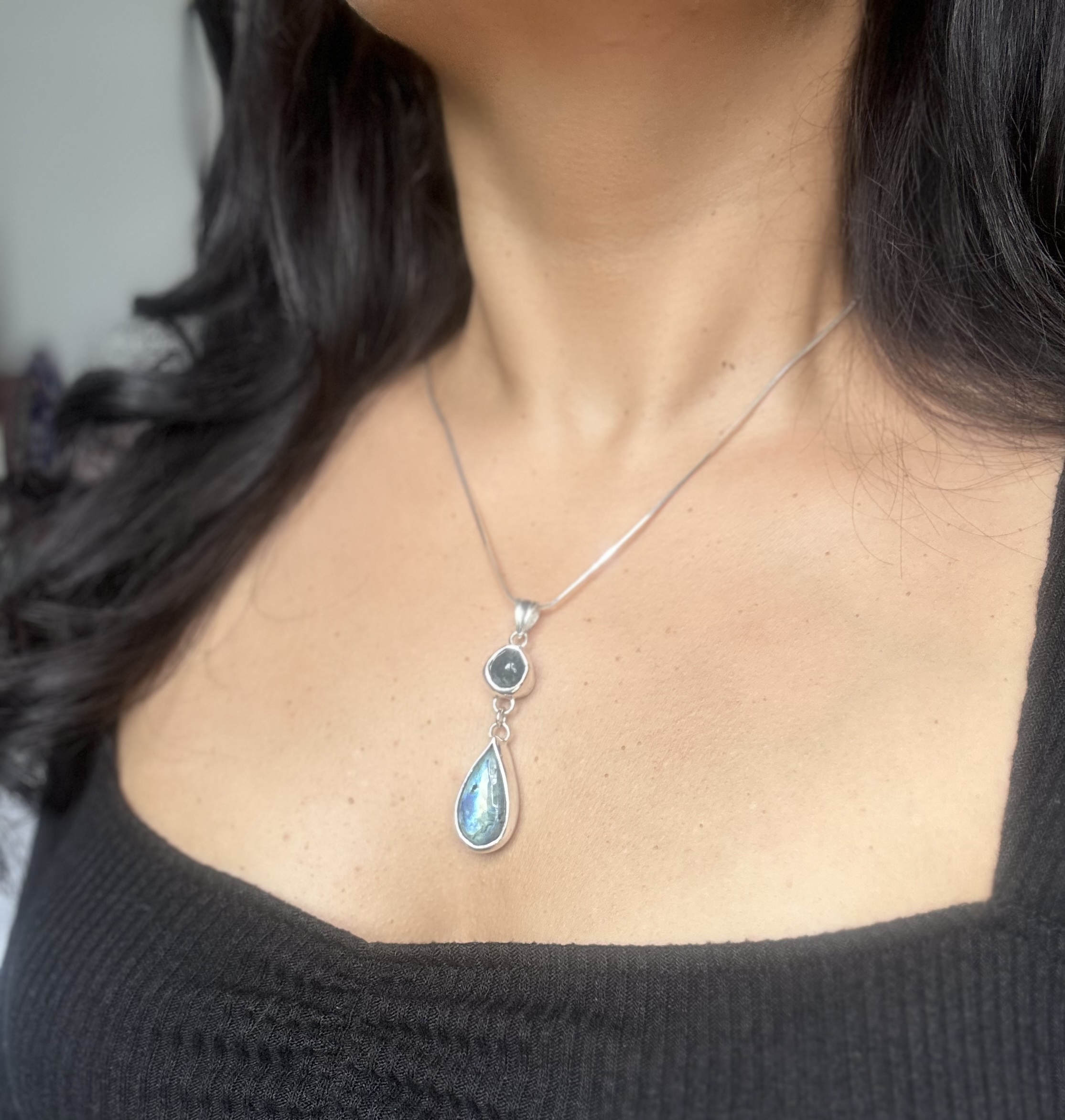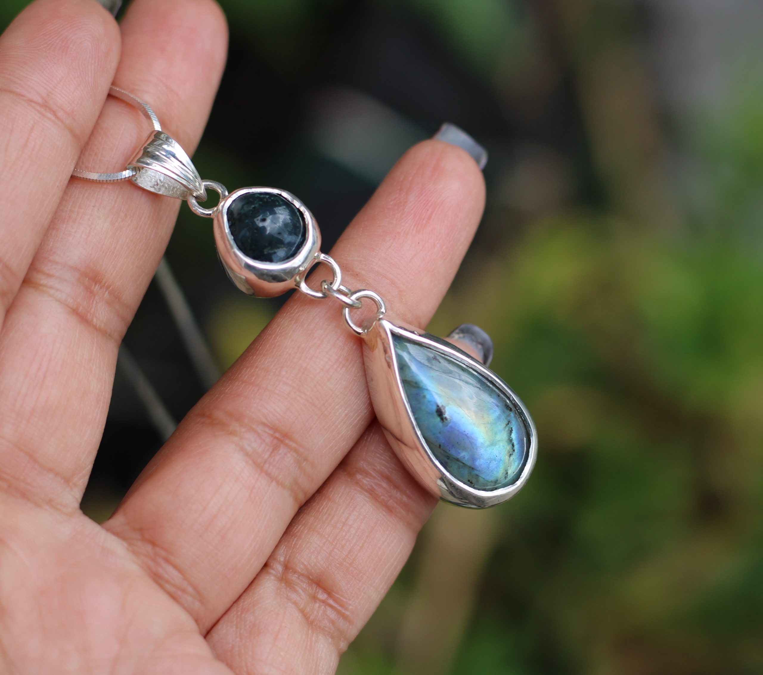 Vaidehi Blue Labradorite Pendant Necklace is handmade in sterling silver with iridescent labradorite and agate gemstone. Labradorite pendant comes with Rhodium polished 18in sterling silver chain.