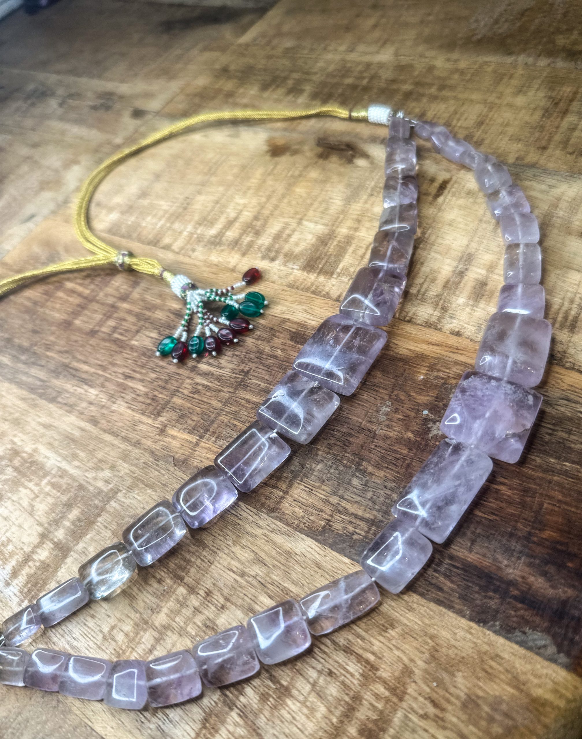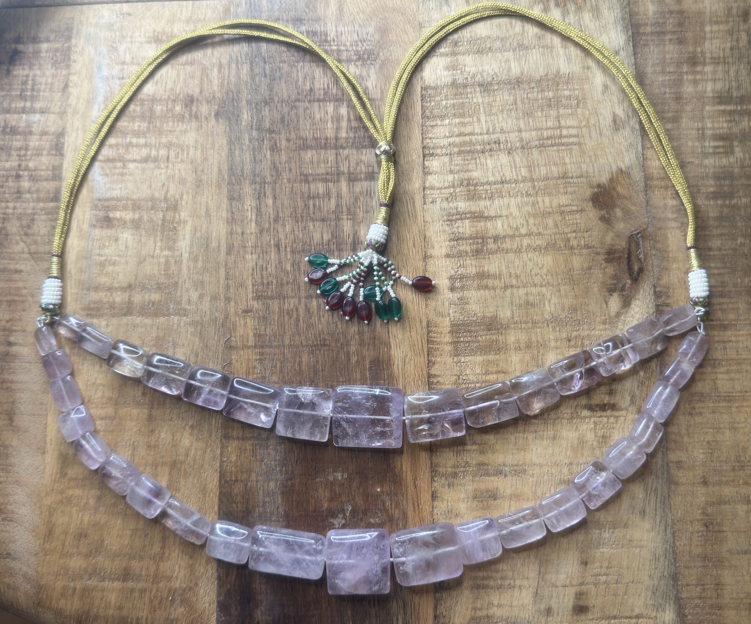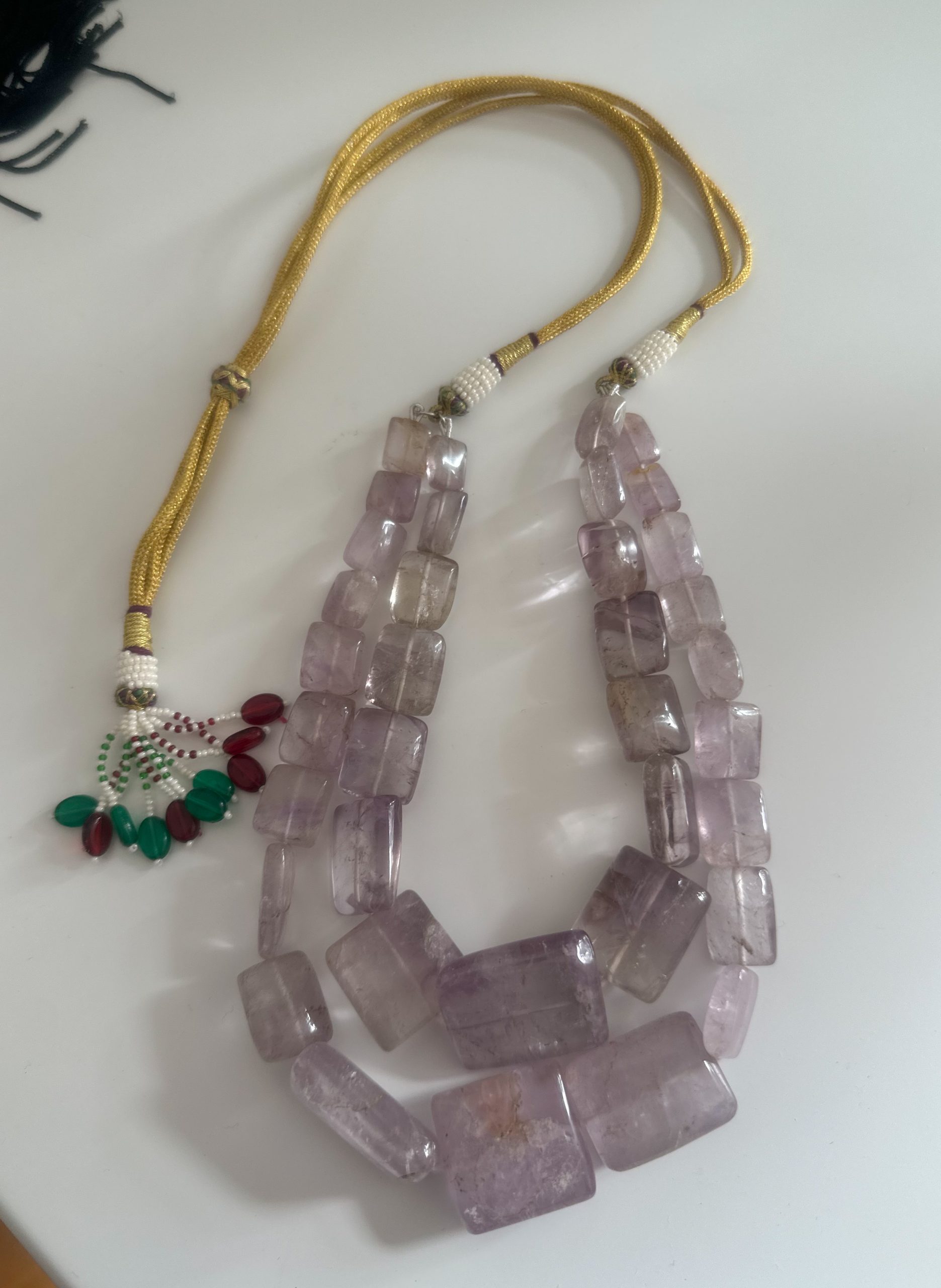 Beautiful vintage lavender quartz stones beaded to make a chunky necklace. This is restored vintage piece with double quartz layers and traditional Indian adjustable string/dori. One of a kind piece.