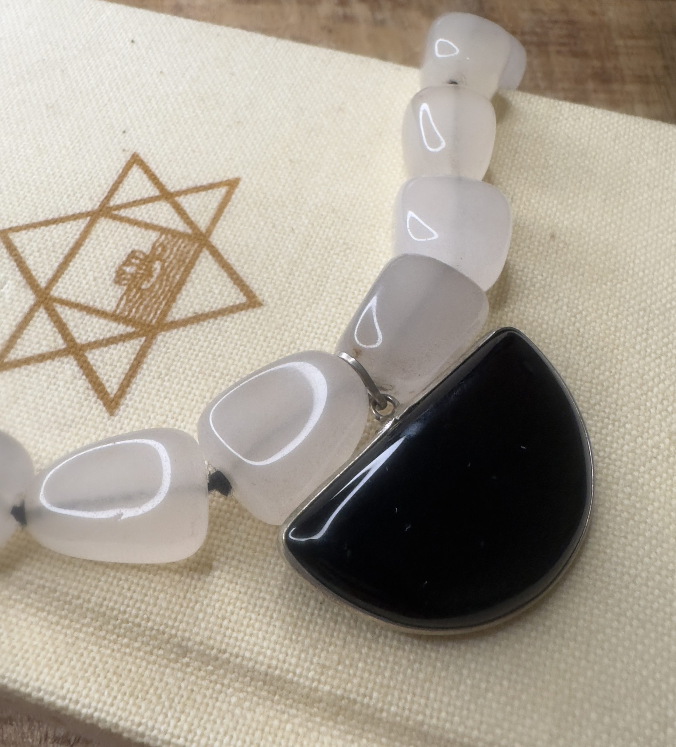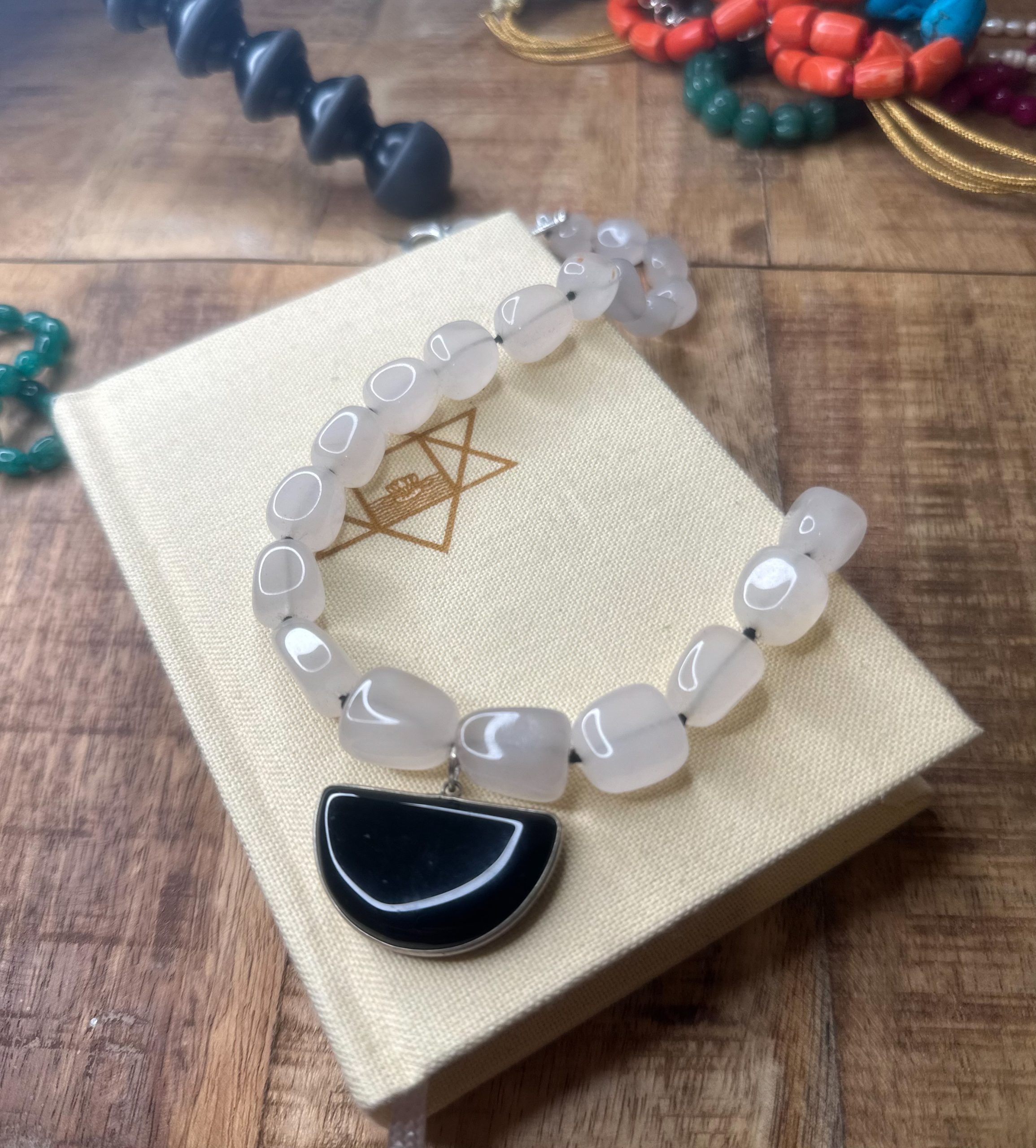 Discover the elegance and tranquility of our White Aventurine Bead Necklace, featuring a striking half-circle Black Agate pendant. This chic accessory combines the serene energy of white aventurine with the grounding properties of black agate, making it both a stylish and meaningful addition to any wardrobe.